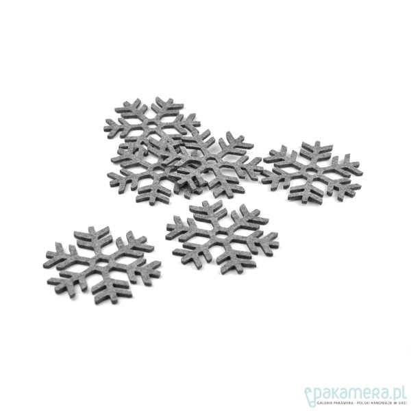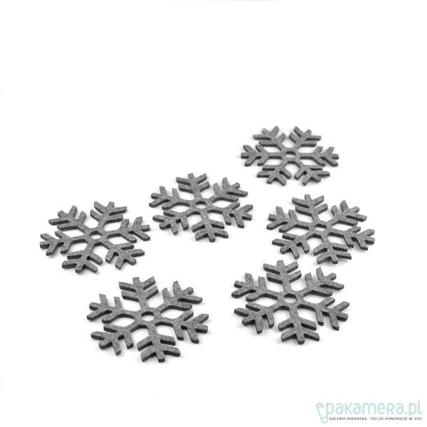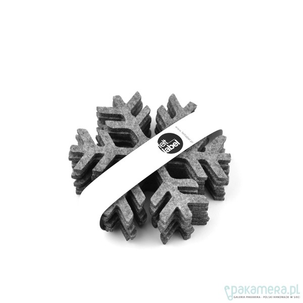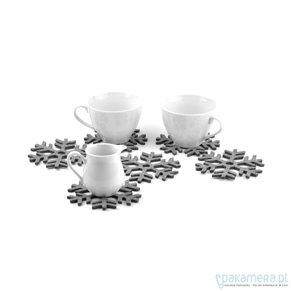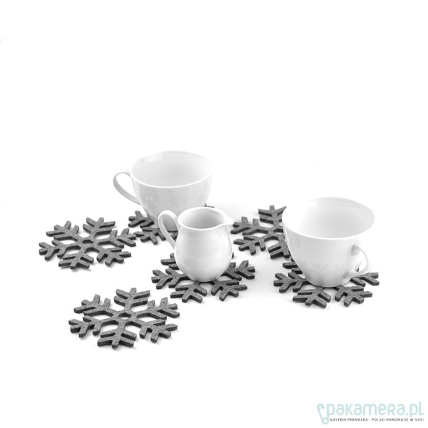 przepiękne, filcowe śnieżynki służące jako podkładki pod kubki lub inne elementy wystroju wnętrz - model: SixFeltSnowflakes - kształt: śnieżynki - kolor: szary - liczba elementów: 6 - wymiary: pojedynczy element 13 cm x 13 cm - materiał: filc 4 mm - interesuje Cię inny kolor? inna wielkość/ilość? napisz do nas!