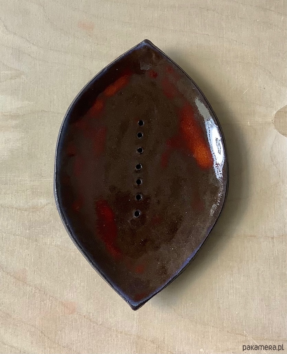 Duża mydelniczka w kształcie migdału, zrobiona z ciemnej gliny, szkliwionapięknym, transparentnym szkliwem z przebłyskami czerwieni.