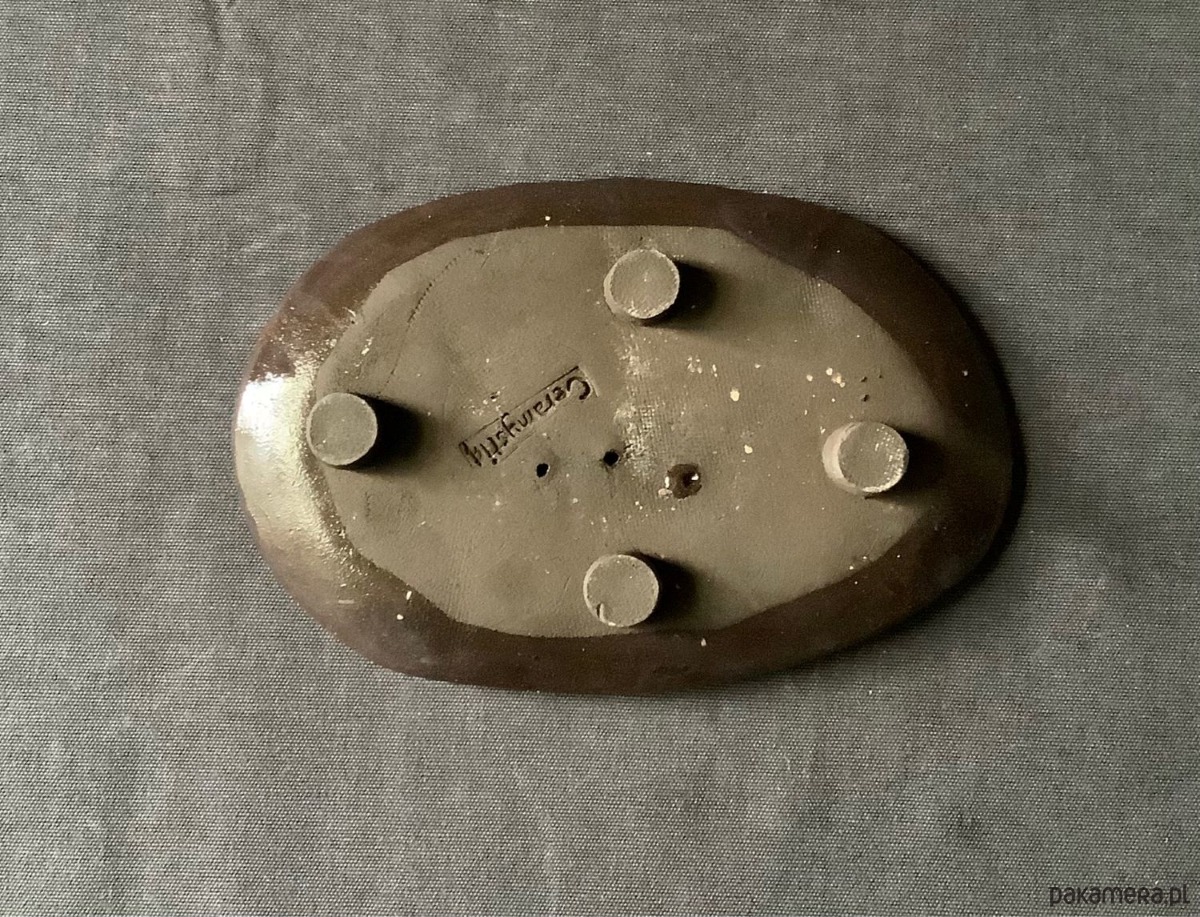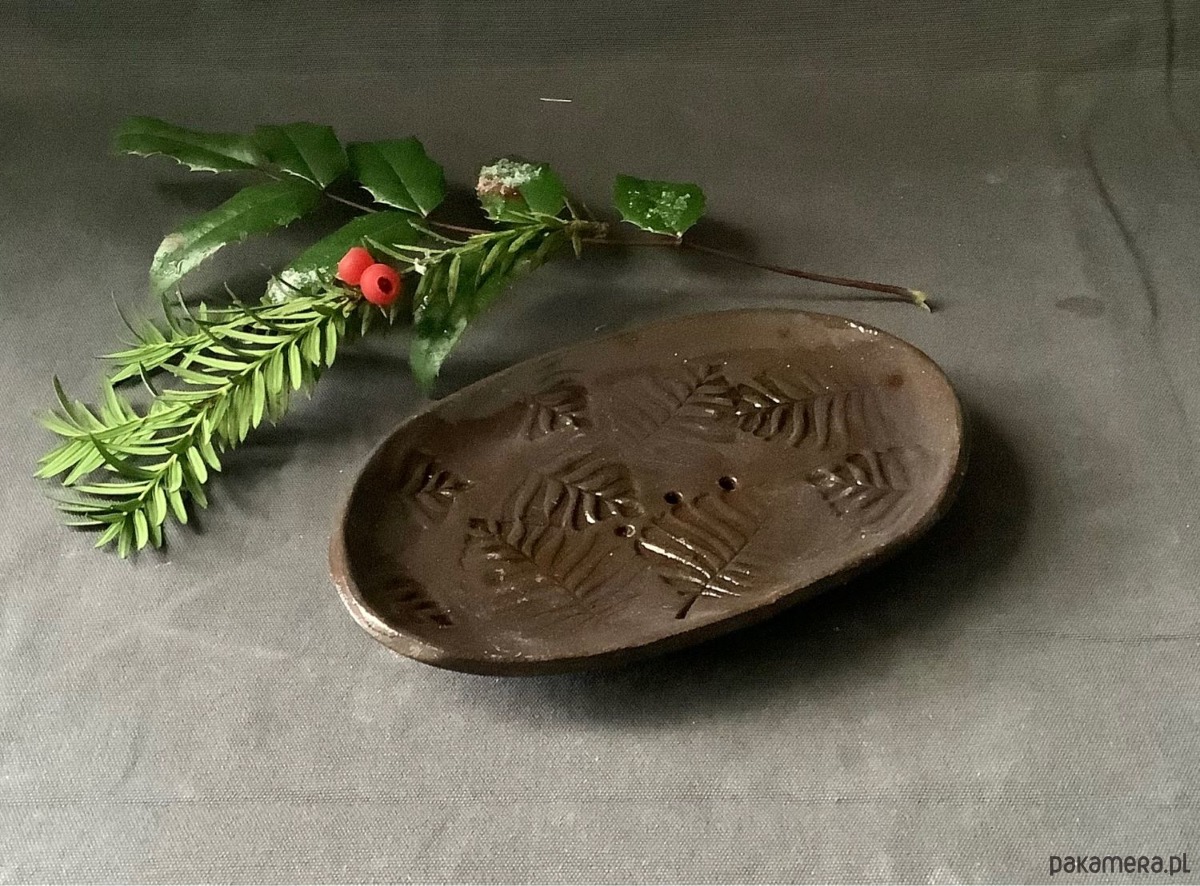 Ręcznie wykonana z ciemnej gliny owalna mydelniW mydelniczce są dziurki ,umożliwiające odpływ nadmiaru wody. Jedna z trzech dziurek zalała się szkliwem.Na spodzie gliniane stopki.