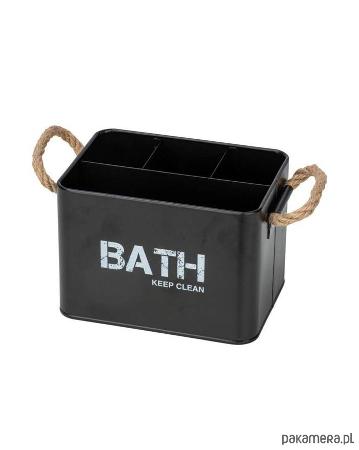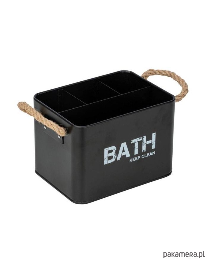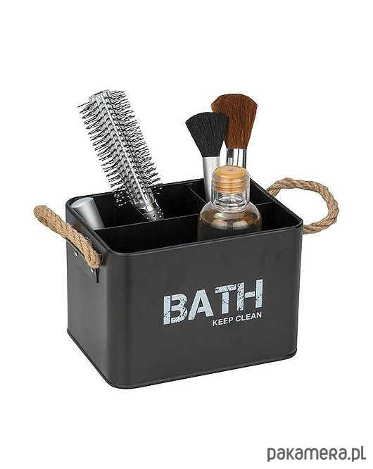 Organizer łazienkowy w kształcie pudełka. Wnętrze podzielone zostało na 4 części. Wyposażony w uchwyty ze sznura. Bardzo wygodny sprzęt w łazience, dla utrzymywania w porządku np. szczotek, grzebieni. Może być również stosowany jako organizer w kuchni, pokoju, biurze.
