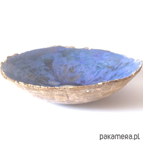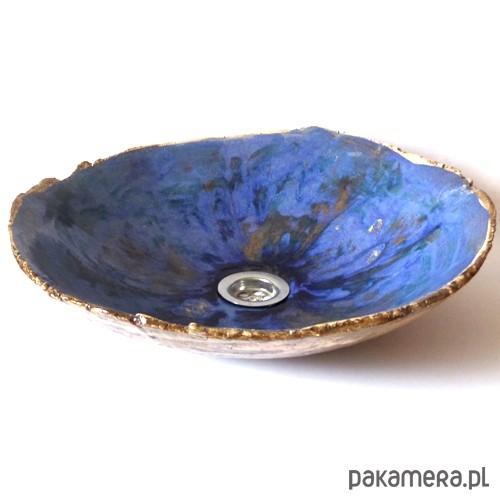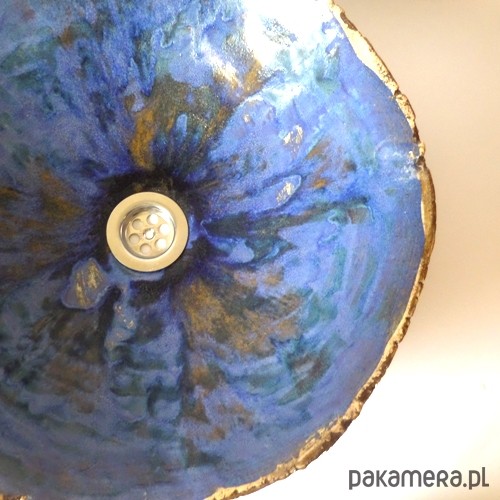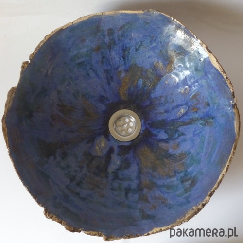 Umywalka ceramiczna nablatowa, formowana ręcznie z gliny szamotowej, szkliwiona wewnątrz w kolorze granatowym, na zewnątrz w kolorze brązowym, krawędź nieregularna, piękna, oryginalna i w pełni funkcjonalna, średnica umywalki to 43 cm, wysokość ok. 10 cm, polecam.