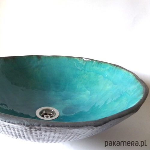 Umywalka ceramiczna, nablatowa, formowana ręcznie z gliny szamotowej, szkliwiona wewnątrz w kolorze turkusowym na zewnątrz w kolorze szarym-metalicznym, średnica umywalki to 47 cm, wysokość 17 cm, polecam.