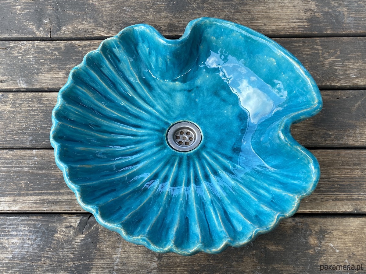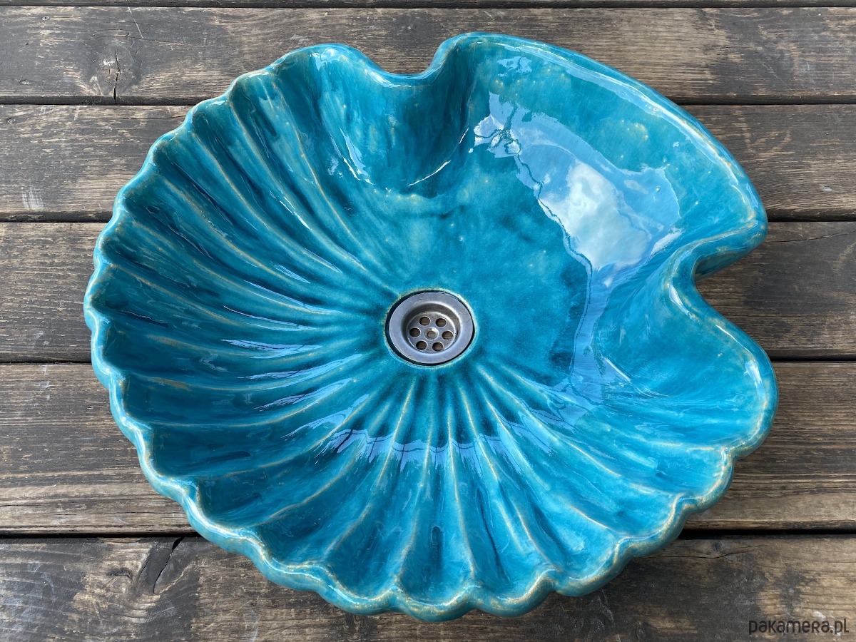 Umywalka ceramiczna turkusowa muszla. Zlew o unikalnym kształcie, pokryty turkusową emalią. Jest niezwykle uroczy, a jednocześnie funkcjonalny i trwały. Wyjątkowy.
