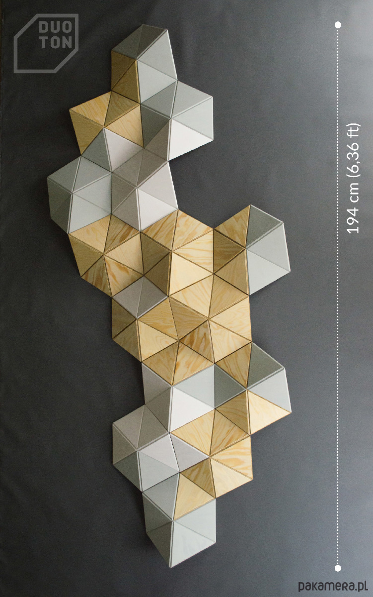 Cell to przestrzenna dekoracja ścienna złożona z piętnastu sześciokątnych modułów. Na fotografiach prezentujemy kompozycję, którą można zamontować wertykalnie lub horyzontalnie.