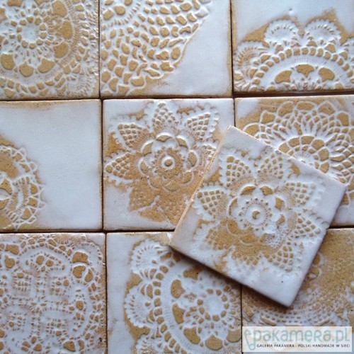 Zestaw 10 płytek ceramicznych formowanych ręcznie z gliny szamotowej, kafle pokryte zostały szkliwami w kolorze białym i transparentnym, płytki jak wszystkie artkafle są odporne na ścieranie, wodę, temperatury, montaż kafli standardowy, polecam.