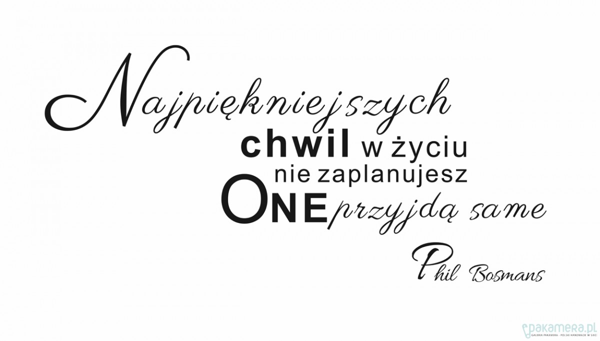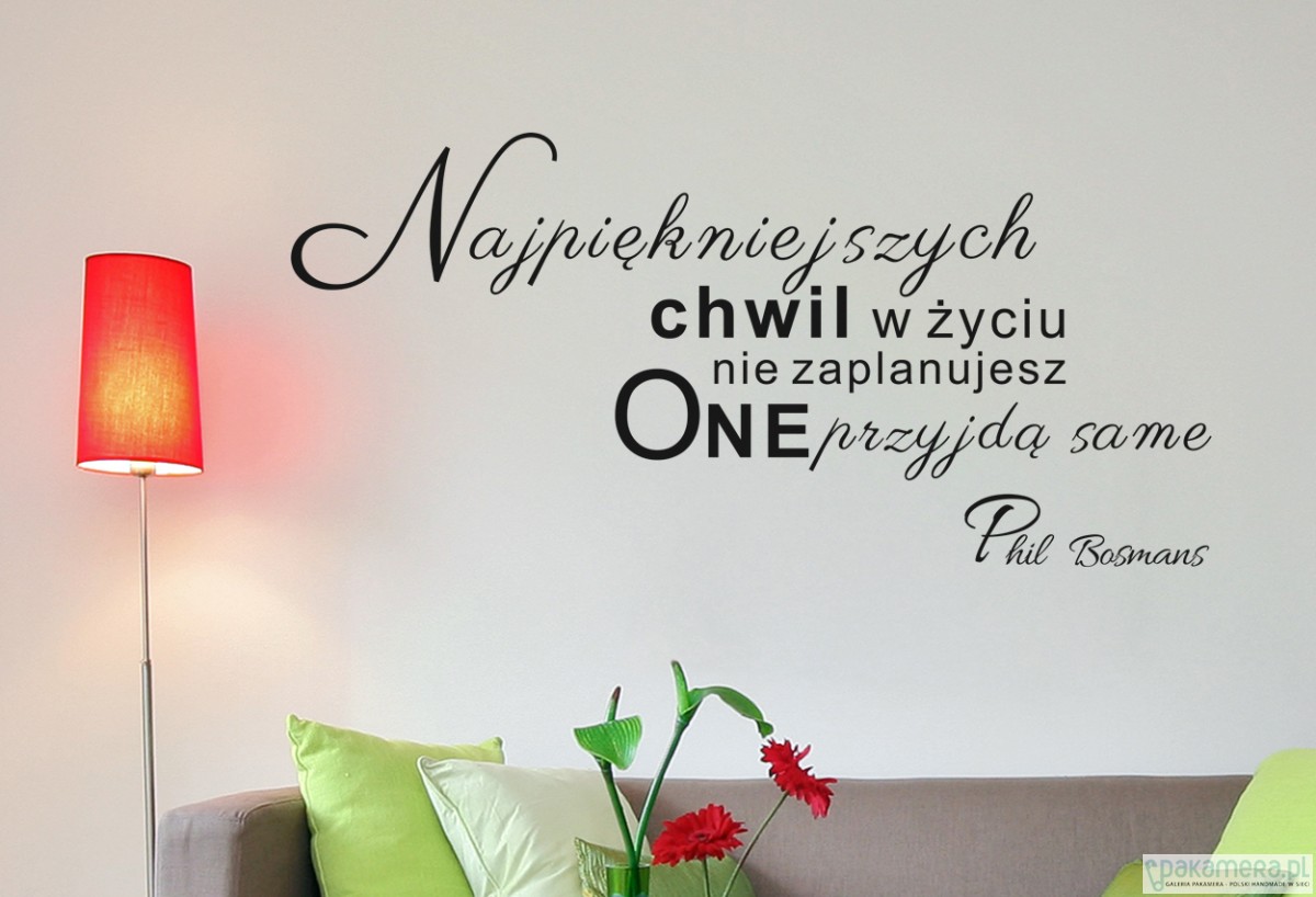 Naklejka ścienna "Najpiękniejszych chwil w życiu nie zaplanujesz. One przyjdą same" Phila Bosmansa to autorski projekt. Wymiary naklejki: 110 cm x 52 cm. MOŻLIWOŚĆ WYBORU RÓŻNYCH KOLORÓW NAKLEJEK - PRZY ZAMÓWIENIU PODAJ NUMER NAKLEJKI. Jeśli nie otrzymam informacji o kolorze to wysyłam CZARNY. Naklejki wykonane z bardzo trwałej matowej folii, idealnie przywierają do ściany lub innej gładkiej powierzchni. Na wycięty wzór naklejony jest papier transferowy, aby przy naklejaniu uniknąć przesunięć obiektów. Do każdego zamówienie dołączam instrukcją montażu. Bezpieczna przesyłka w tubie. Termin realizacji zamówienia to 1 dzień roboczy.
