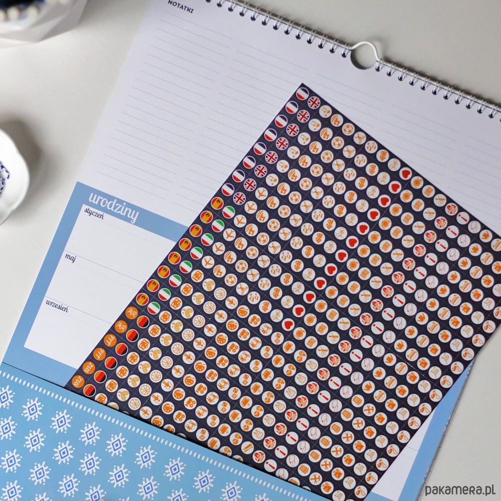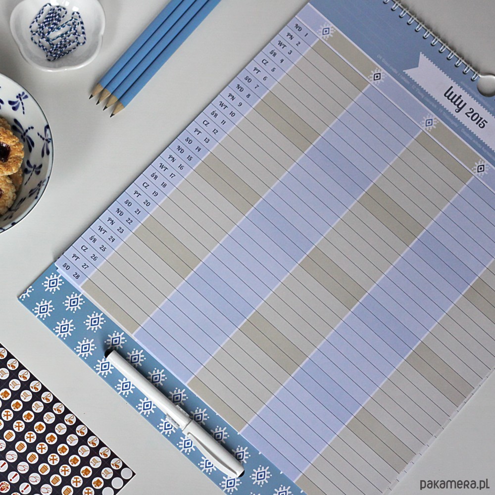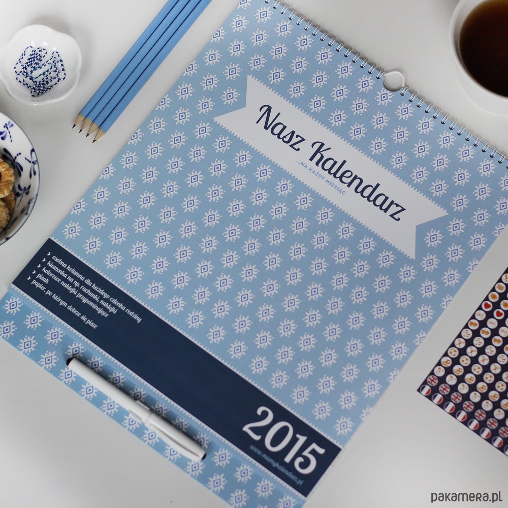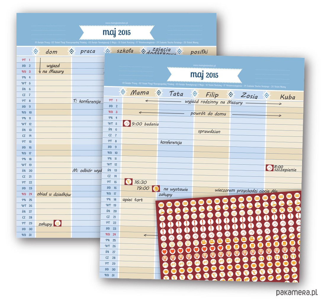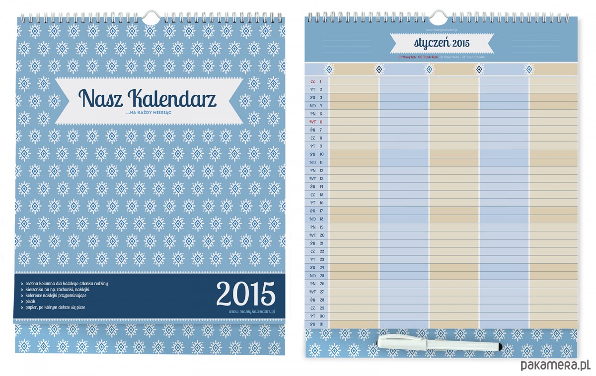 Kalendarz rodzinny, ścienny, na każdy miesiąc w 2015 roku. - osobna kolumna dla każdego członka rodziny - kieszonka na np. rachunki, naklejki - kolorowe naklejki przypominające - pisak - papier, po którym dobrze się pisze - wymiary: 30cmx34cm