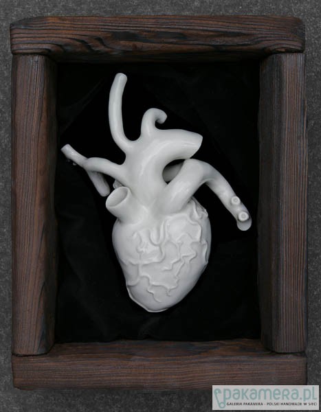 Ceramiczne serce ( PORCELANA ) umieszczone jest na czarnej, pluszowej poduszeczce w drewnianej skrzyneczce (gruba, nieheblowana decha ) z możliwością zawieszenia i ekspozycji na ścianie. Wymiary skrzyneczki : 24 / 19 / 10,5 cm.