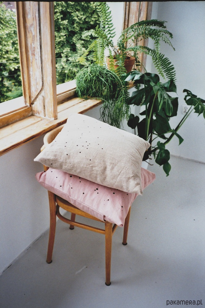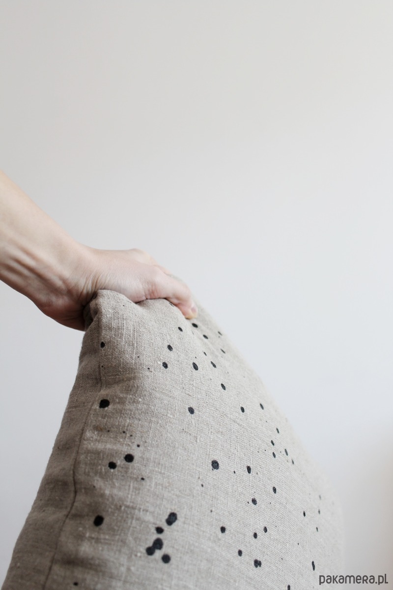 Poszewka z grubszej, naturalnej tkaniny lnianej z ręcznie wykonanymi plamami malarskimi.