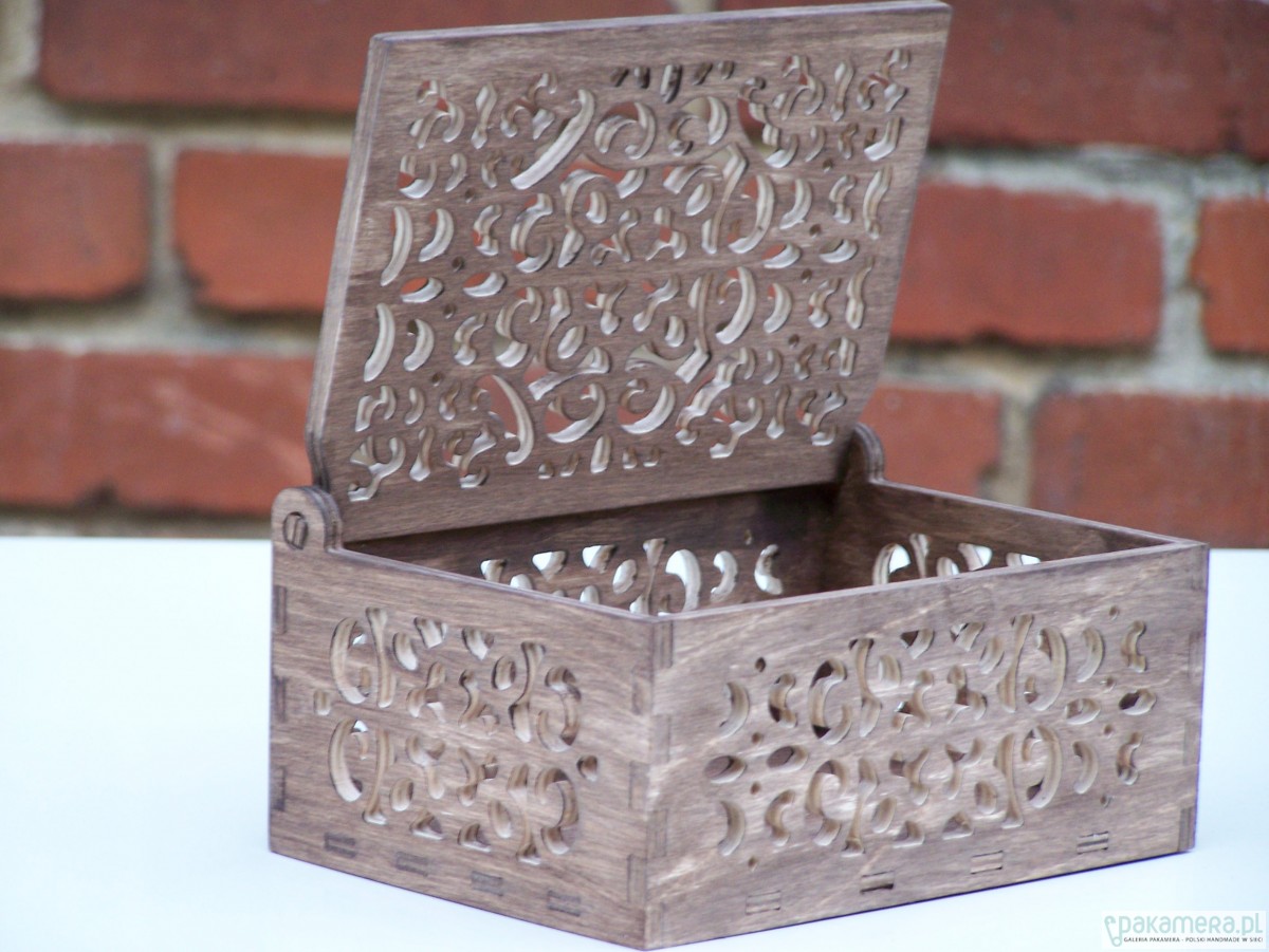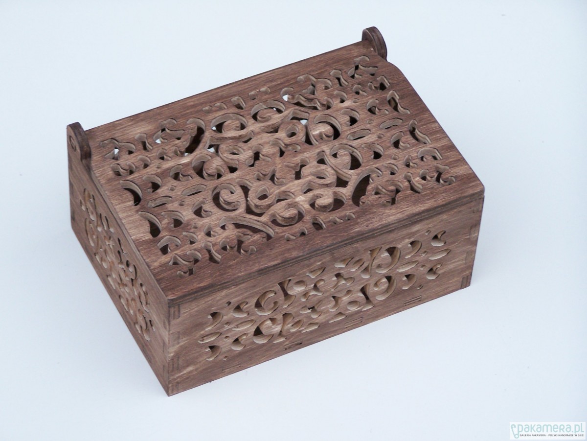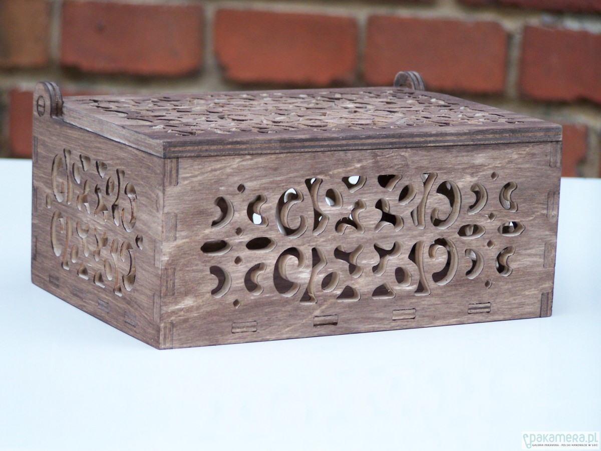 Ażurowe pudełko które będzie piękną ozdobą wnętrza, może pełnić funkcję zarówno szkatułki jak i pudełka na przybory toaletowe. Pudełko jest bejcowane oraz zabezpieczone woskiem. Istnieje możliwość pomalowania pudełka np na biało i przetarcia nadając mu charakterystyczny dla stylu shabby chic efekt. Wymiary zewnętrzne 19 x 15 x 8,5 cm