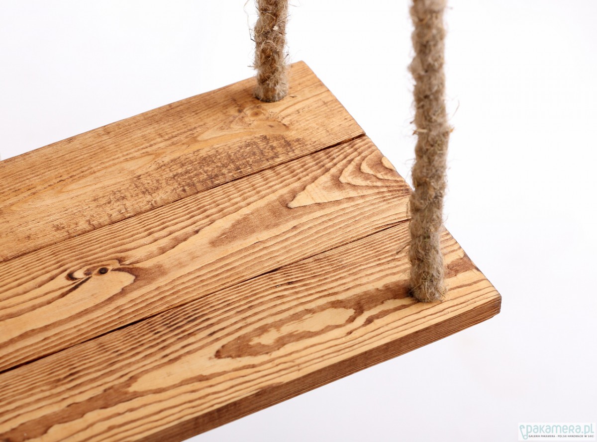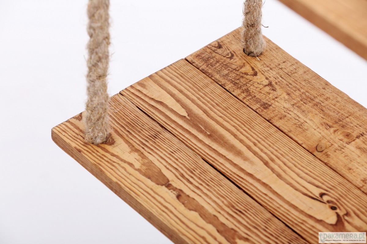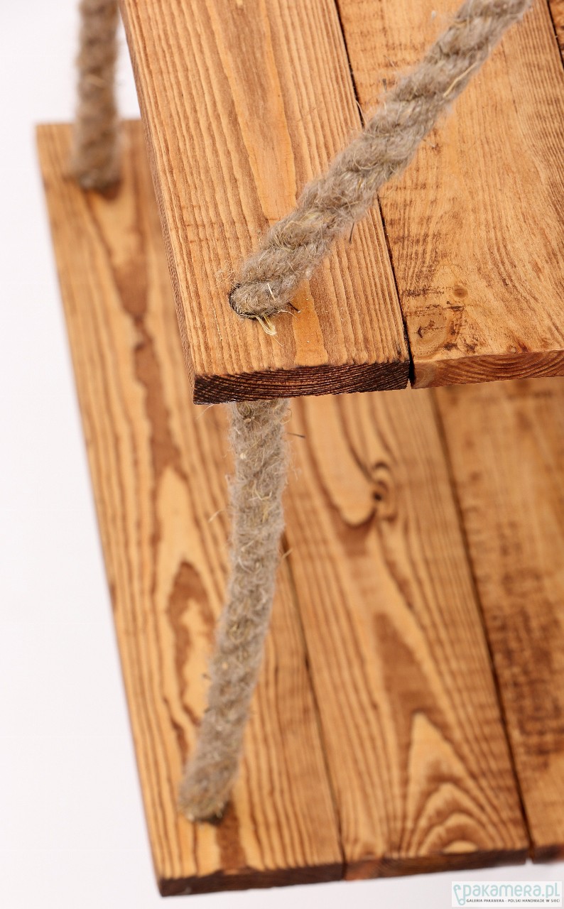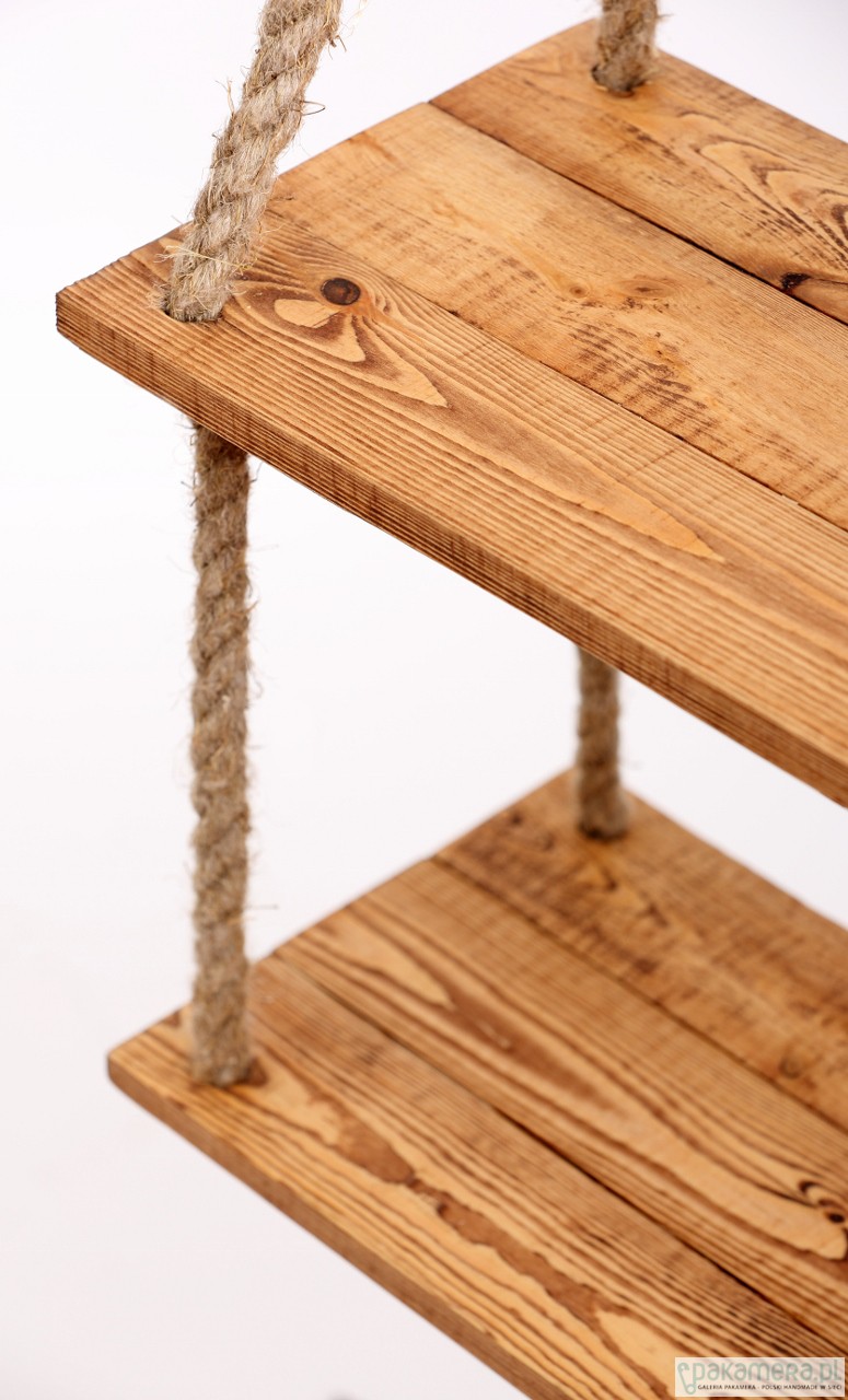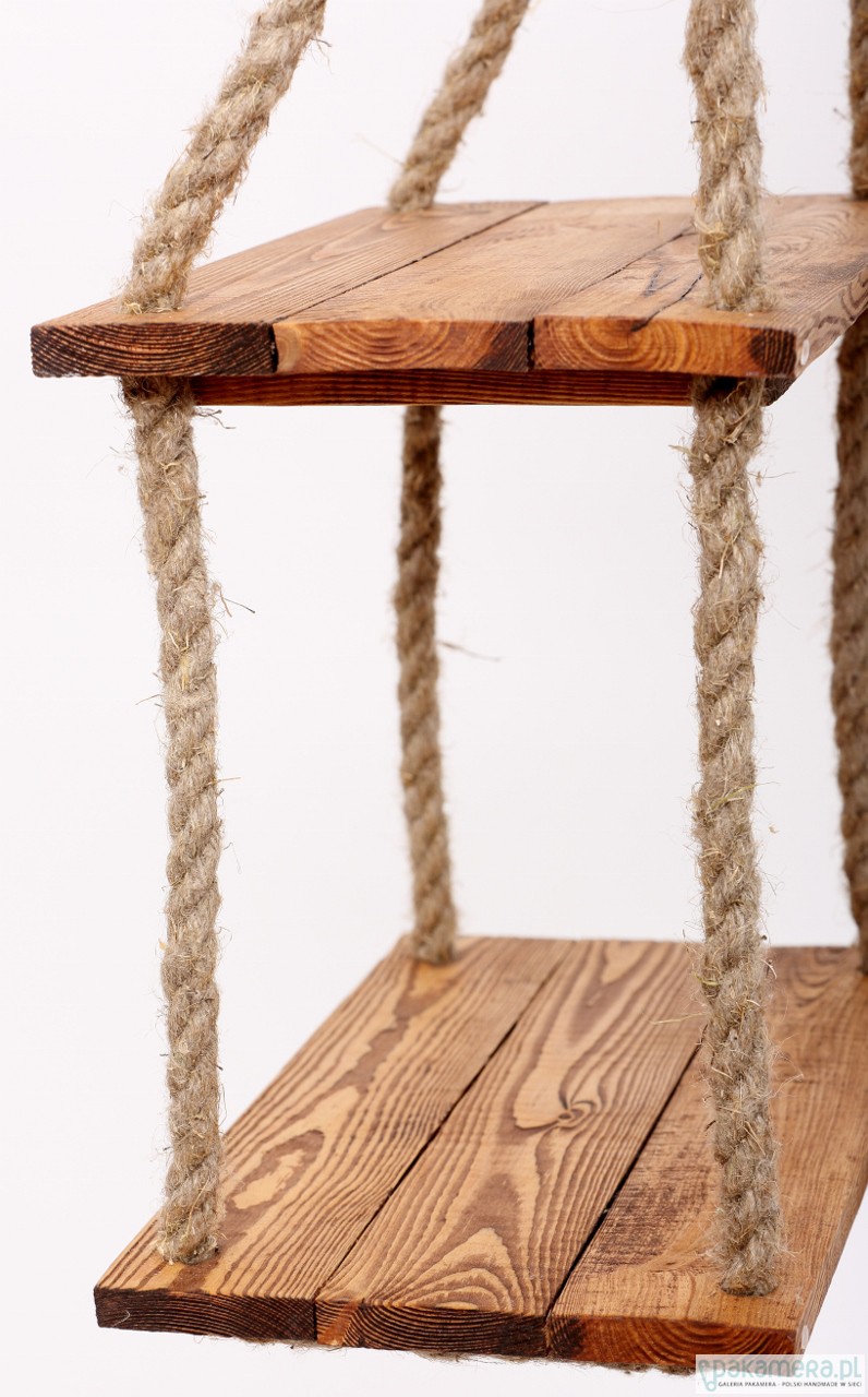 Jedyna w swoim rodzaju półka wisząca na linach konopnych, wykonana z pięknego drewna naturalnego. Wymiary półek: 50x37 cm, odległość pomiędzy półkami: 26 cm. Istnieje możliwość wykonania podobnej półki w innym rozmiarze / kolorze