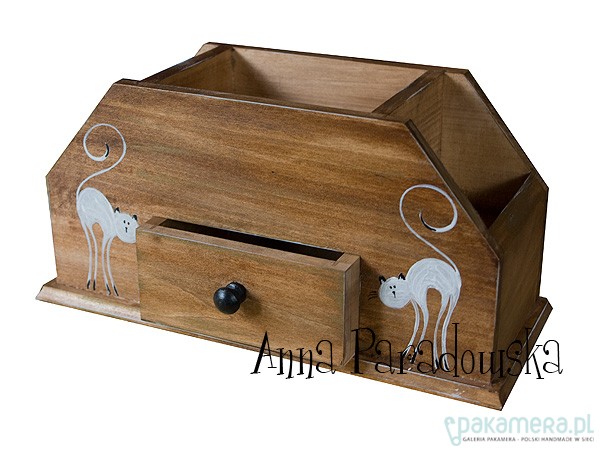 Drewniane pudełko z szufladką na biurko. Przegródki na długopisy, spinacze itd. Ręcznie pomalowane farbami akrylowymi, zabezpieczone ekologicznym lakierem półmatowym. Wym. 29,5 x 12 x 14,5 (wysokość). PRACA RĘCZNIE SYGNOWANA, WZÓR CHRONIONY PRAWAMI AUTORSKIMI