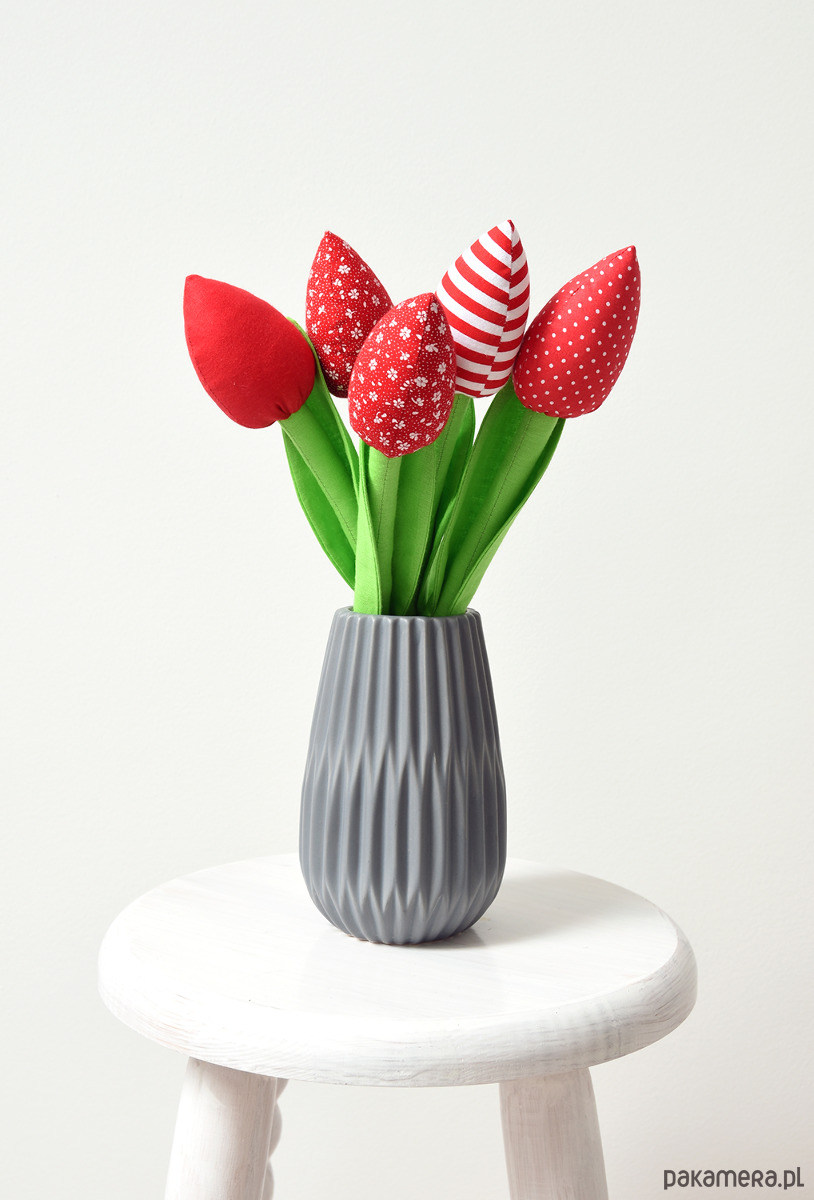 Bukiet 5 uroczych tulipanów uszytych z bawełnianych tkanin w czerwonym kolorze: