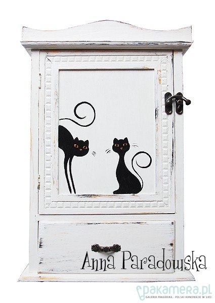 Drewniana szafka na klucze z szufladką ręcznie malowana farbami akrylowymi, zabezpieczona lakierem półmatowym. W środku dwa rzędy wieszaczków (2 x 4 wieszaczki). Wym. 22 x 7 x 33 cm Możliwość zamówienia szafki bez "przetarć", w innym kolorze lub z innym wzorem. PRACA SYGNOWANA, WZÓR CHRONIONY PRAWAMI AUTORSKIMI