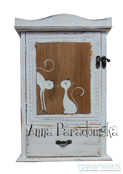 Drewniana szafka na klucze z szufladką ręcznie malowana farbami akrylowymi, zabezpieczona lakierem półmatowym. W środku dwa rzędy wieszaczków (2 x 4 wieszaczki). Wym. 22 x 7 x 33 cm PRACA SYGNOWANA, WZÓR CHRONIONY PRAWAMI AUTORSKIMI