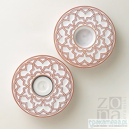 Lampion (świecznik) z geometrycznym, lekko wypukłym ornamentem. Wykonany z ciemnej gliny, pokryty błyszczącym, białym szkliwem, dwukrotnie wypalany w wysokiej temperaturze.