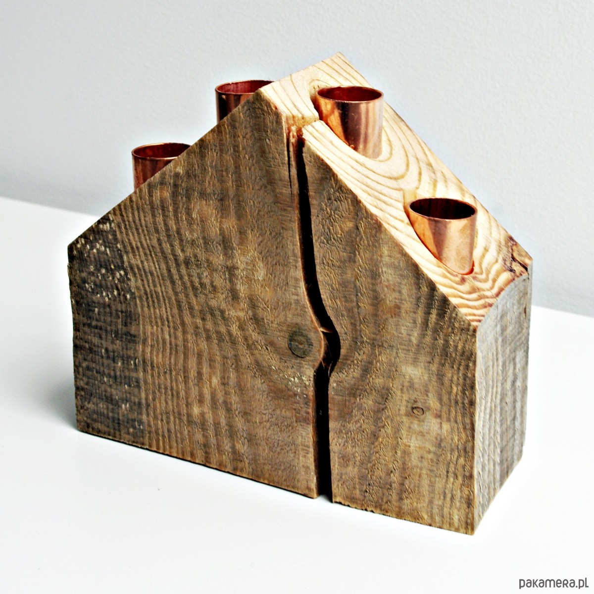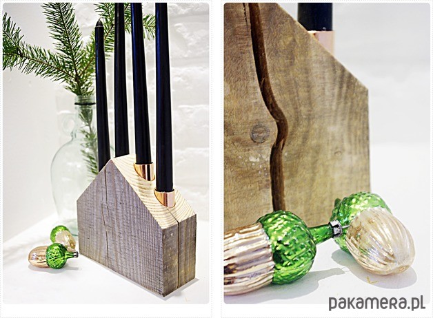 HERRGÅRD to propozycja dla wszystkich, którzy cenią sobie prosty styl skandynawski, lekko industrialny. To prosty świecznik-dom na cztery świece (średnica do 22 mm)wykonany z pięknego dużego i grubego kawałka starego recyklingowego drewna używanego do produkcji palet. Piekne naturalne spękania i rysy dodają mu uroku i majestatu. Przysłowiową kropka nad i są w nim uchwyty na świece wykonane z miedzi! Miedź to hit tego sezonu! Świecznik został wykonany ręcznie z drewna z recyklingu. Może być przepiękną dekoracją podczas zbliżającego się ADWENTU!