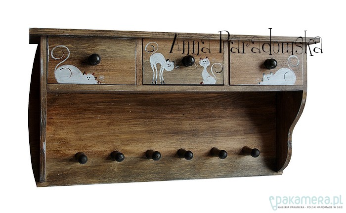 Drewniana szafka-półka z szufladkami i wieszaczkami np. na klucze lub ściereczki. Zarówno do kuchni, jak i do przedpokoju. Ręcznie pomalowana farbami akrylowymi, zabezpieczona lakierem akrylowym (ekologicznym). Zaopatrzona w uchwyty do powieszenia na ścianie. Kolor brązowy + czarne koty. wym. 40,5 x 10 x 21 cm PRACA RĘCZNIE SYGNOWANA, WZÓR CHRONIONY PRAWAMI AUTORSKIMI