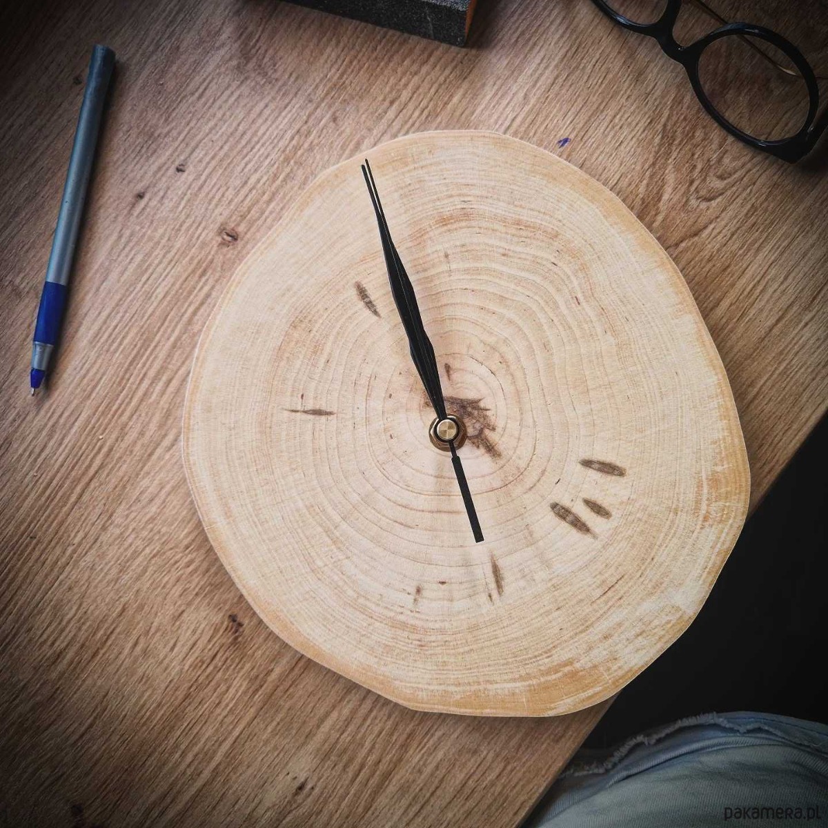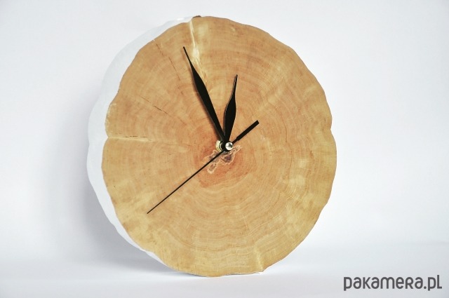 Drewniany zegar w najprostszej, naturalnej formie - drewnianego plastra, starannie wyszlifowanego i zaopatrzonego w wysokiej jakości mechanizm.