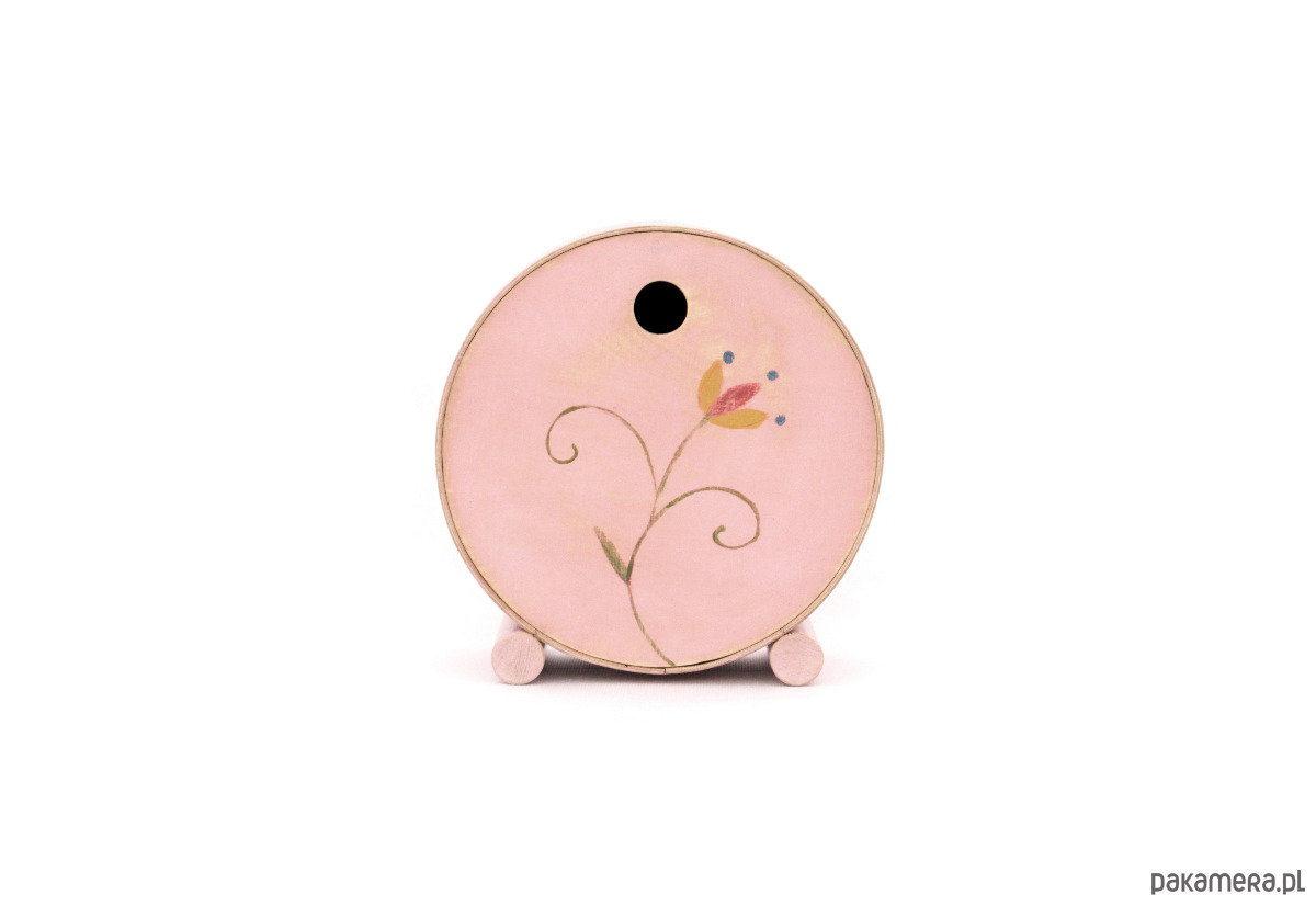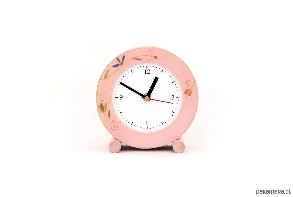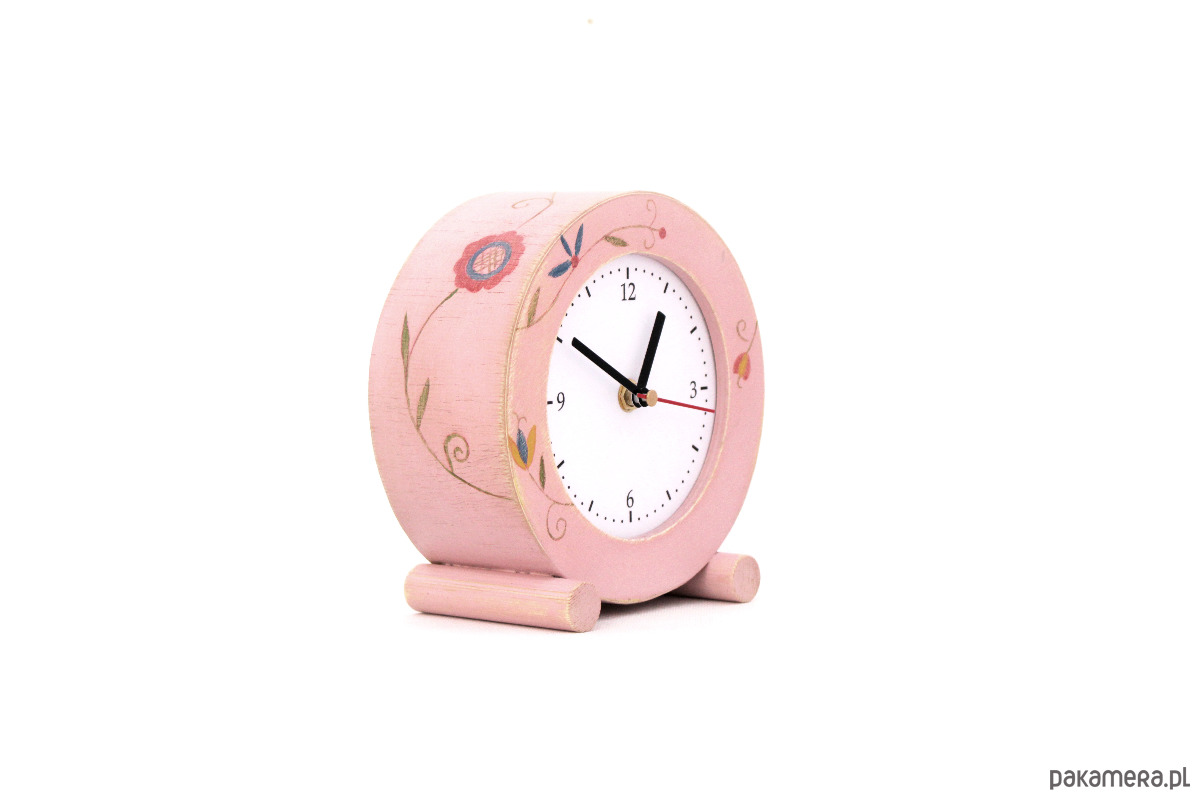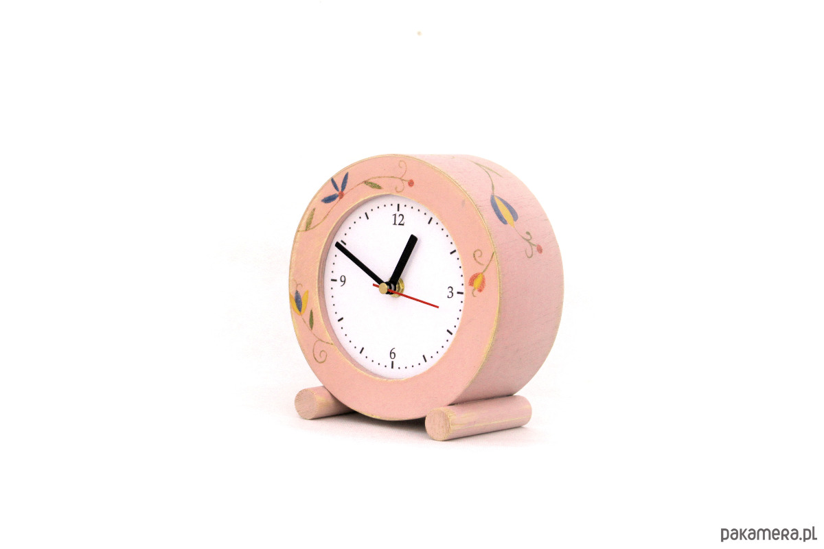 zegarek pomalowany farbami akrylowymi zabezpieczony ekologicznym lakierem. Wykonany ze sklejki drewnianej o wymiarach - śr 18 cm, wys.19 cm, gł. 9 cm.