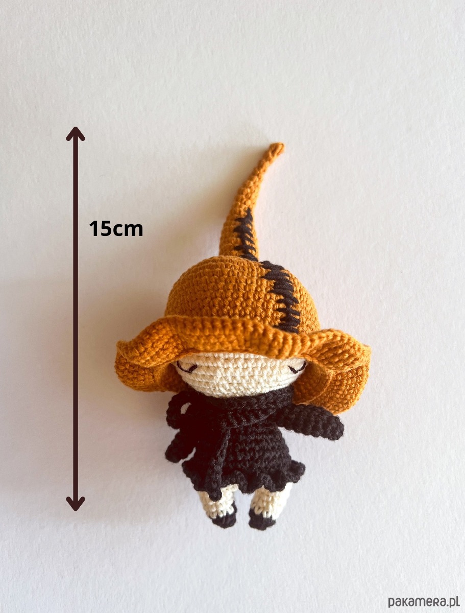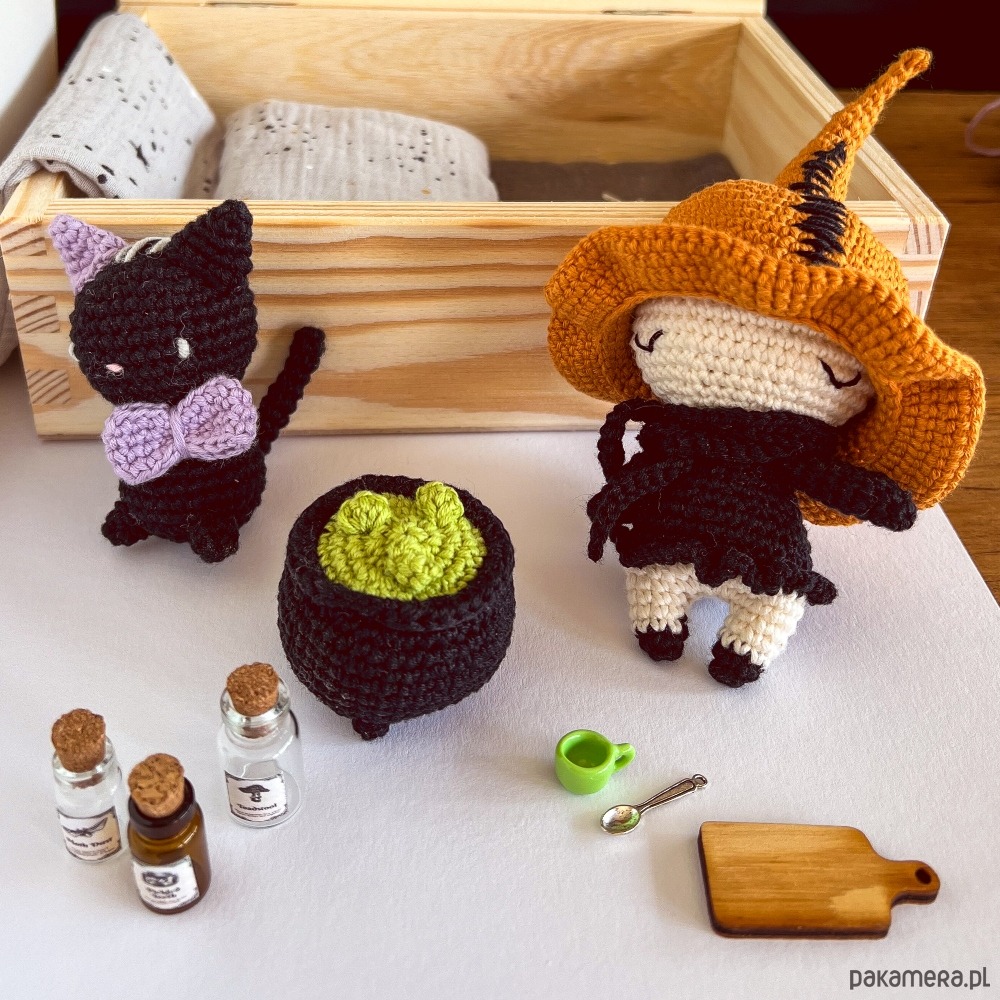 Szydełkowa wiedźma i kotek: Urocze, różowe postacie wykonane na szydełku są miękkie i przyjemne w dotyku, idealne do przytulania.