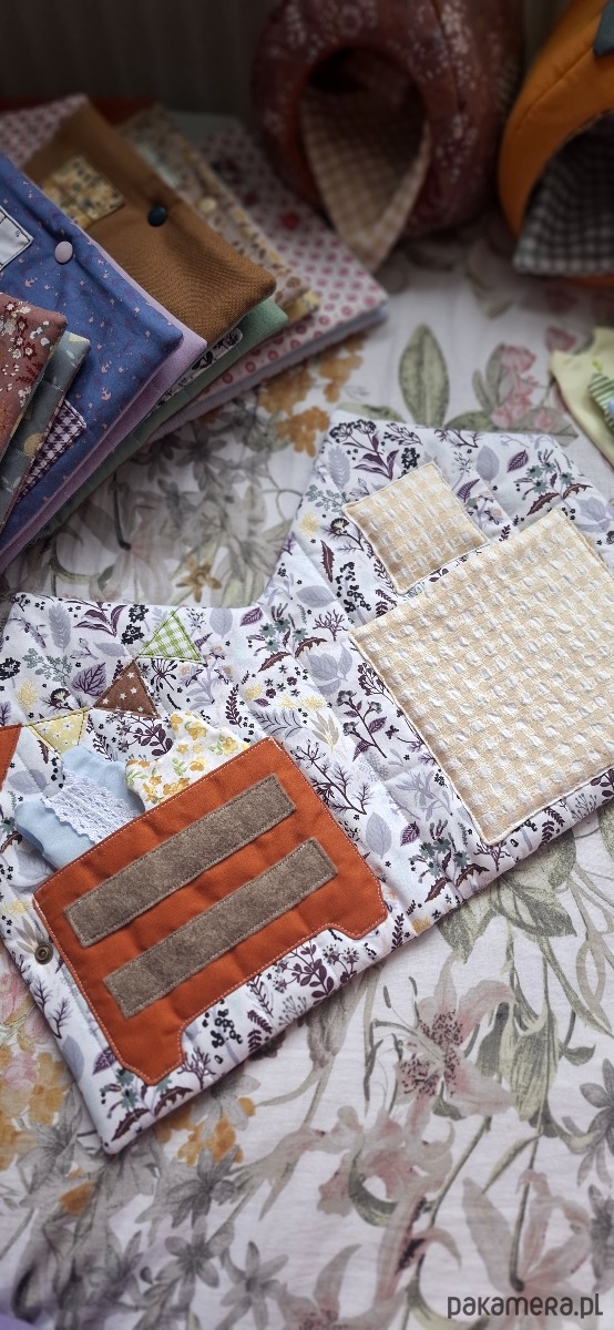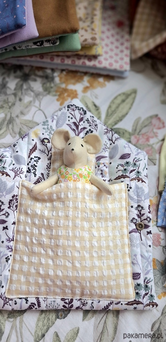 Myszka z domkiem uszyte są z tkanin bawełnianych, nadające się do prania ( 30'C ) i prasowania. Zapinane są na napy, dzięki czemuż zapięciem poradzą sobie nawet malutkie rączki.