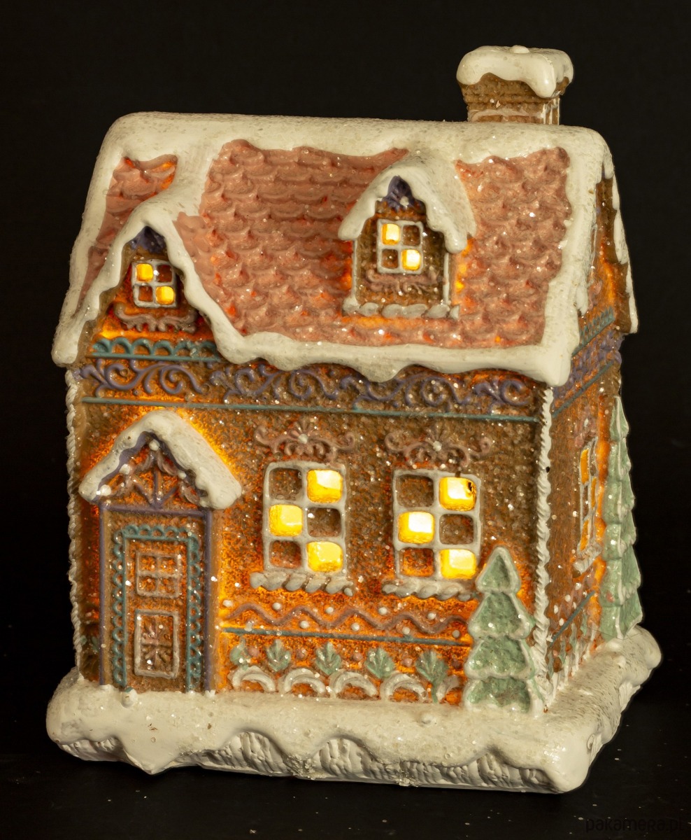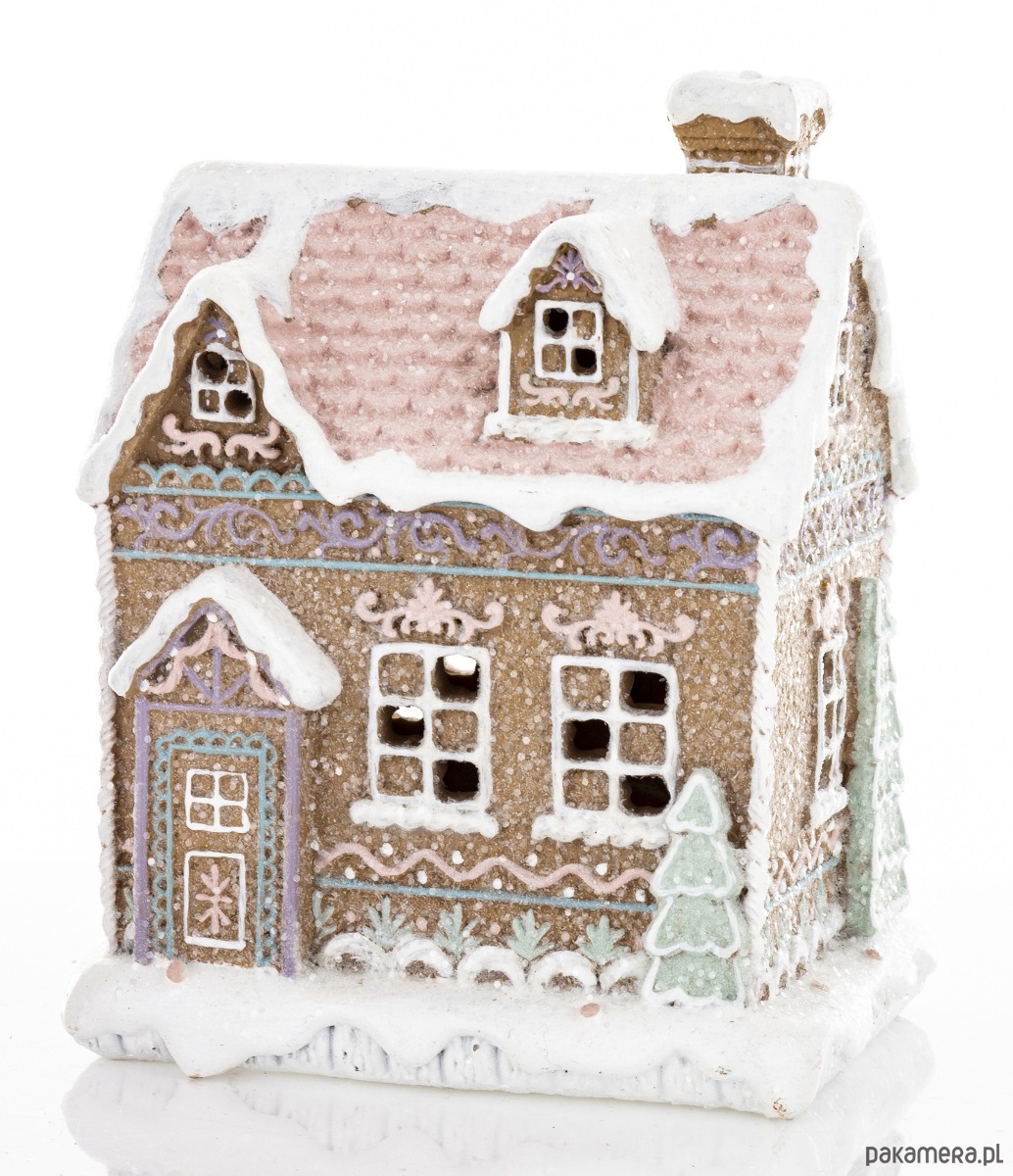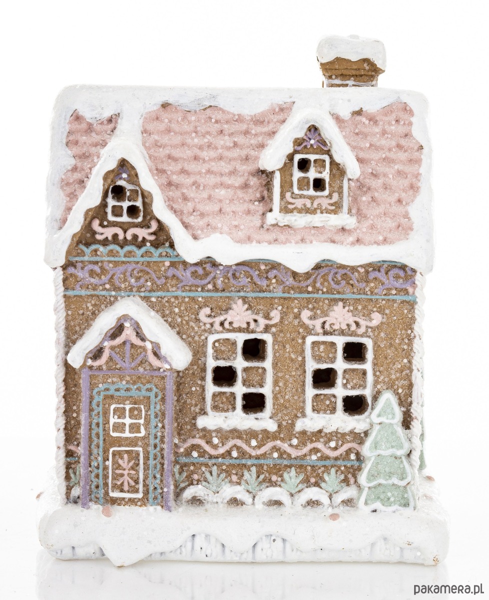 Dekoracja świąteczna w postaci pastelowego domku z piernika. Pięknie zdobiony. Spadzisty dach ma dachówki w kolorze różowym. Choinka stoi na rogu domku. Domek został wykonany z tworzywa sztucznego w dominującym kolorze brązowym. Zasilanie 3xAAA