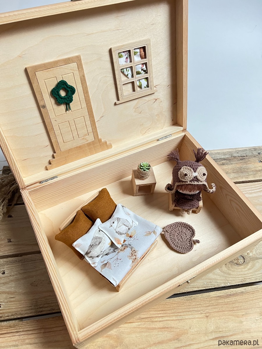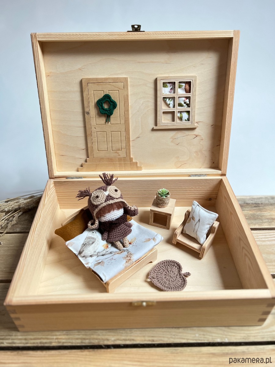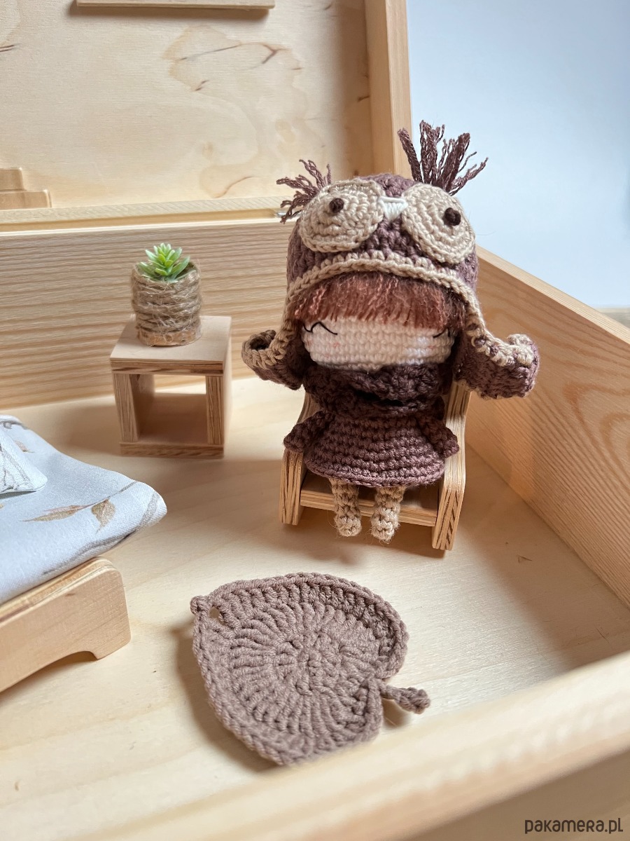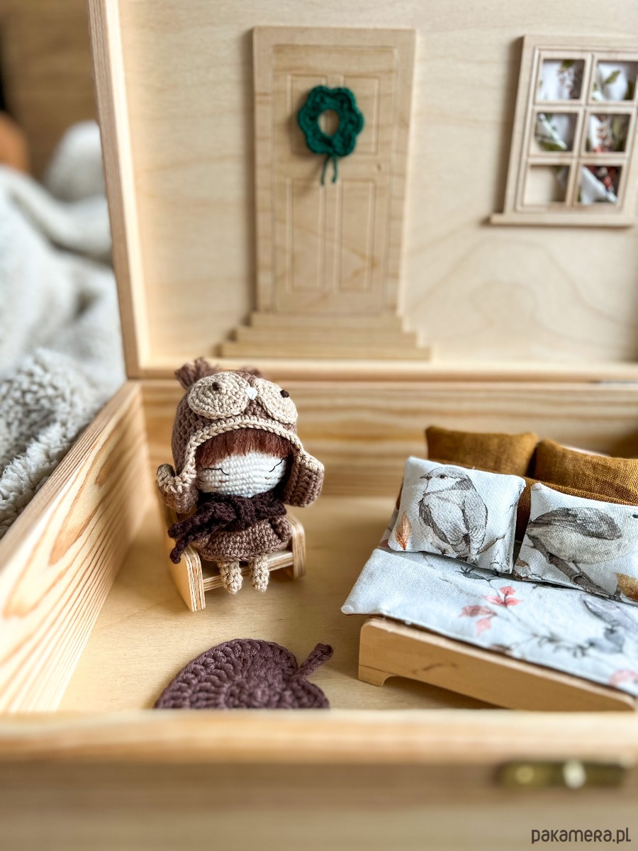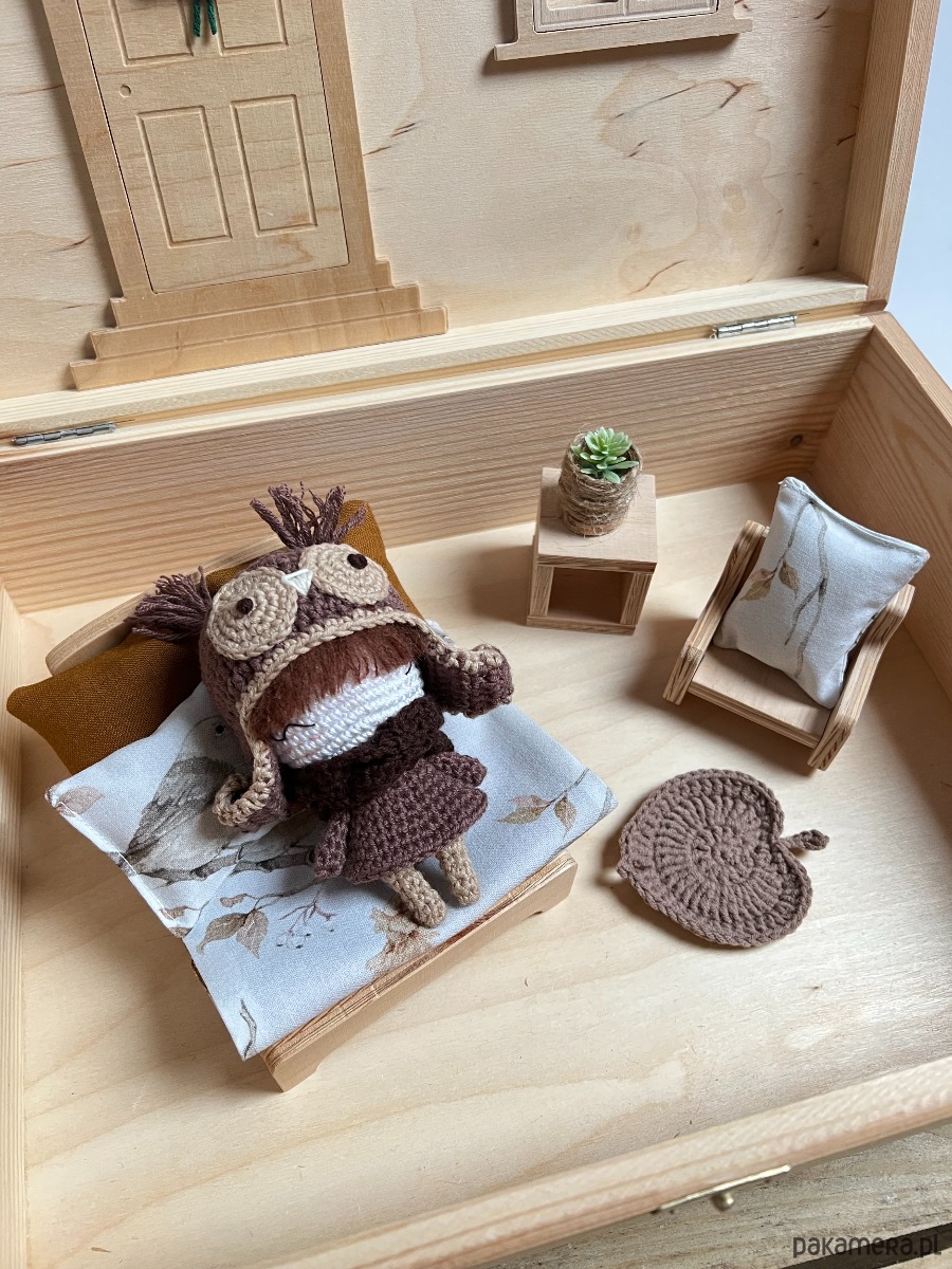 Dodatkowo w domku mieszka Sowa Licja, wydziergana na szydełku, jej wysokość to ok.10cm.