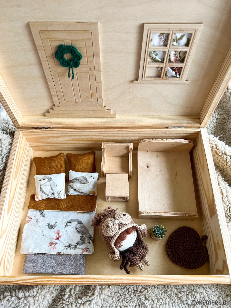 Domek jest ze sklejki, pościel i poduszki uszyte z bawełny i lnu, dywanik szydełkowy.