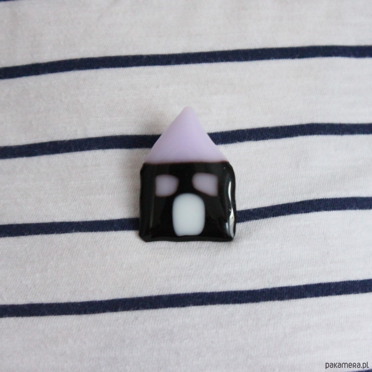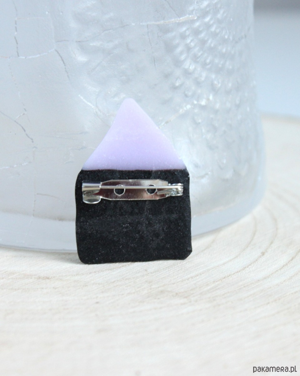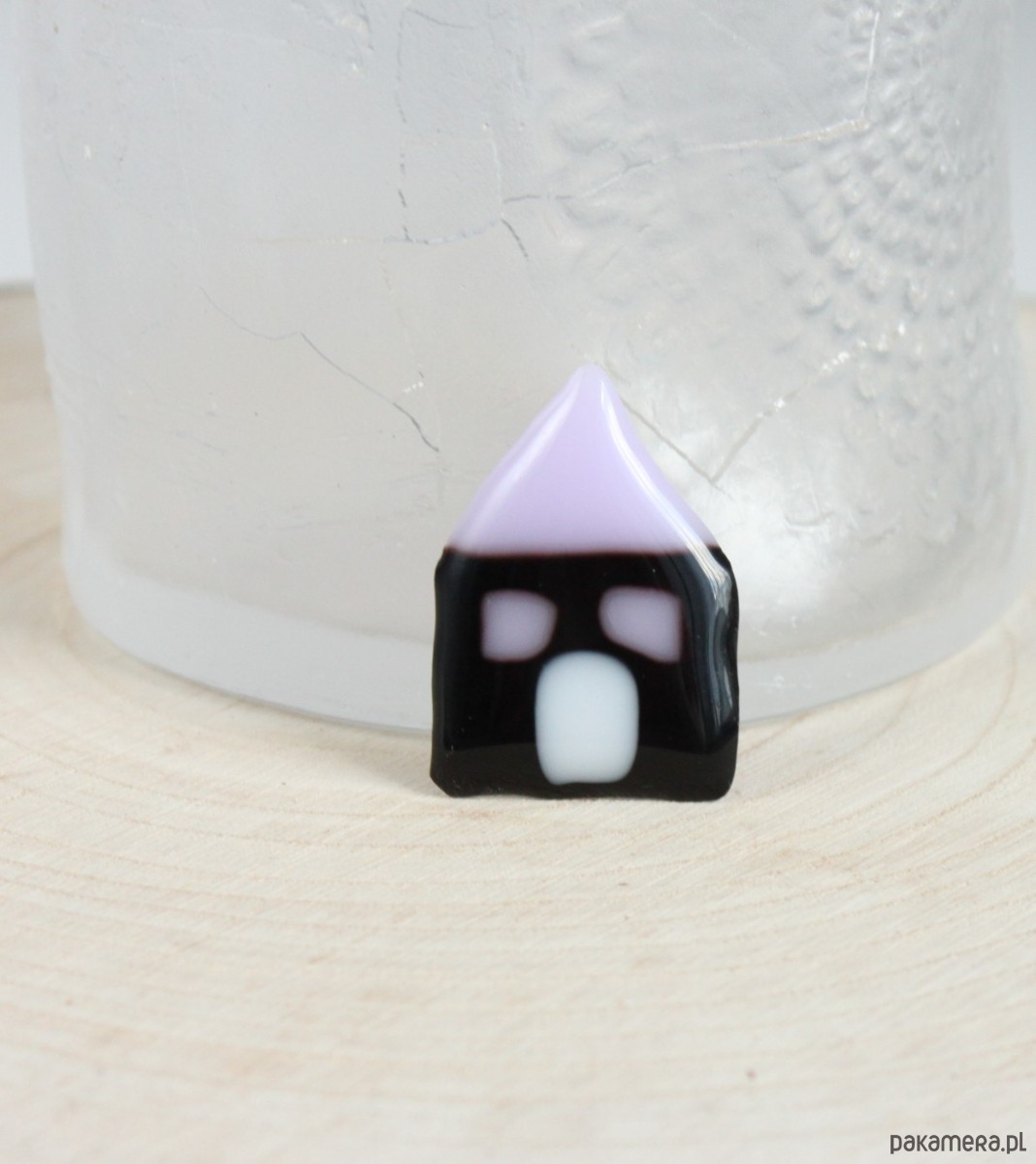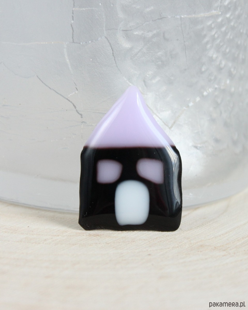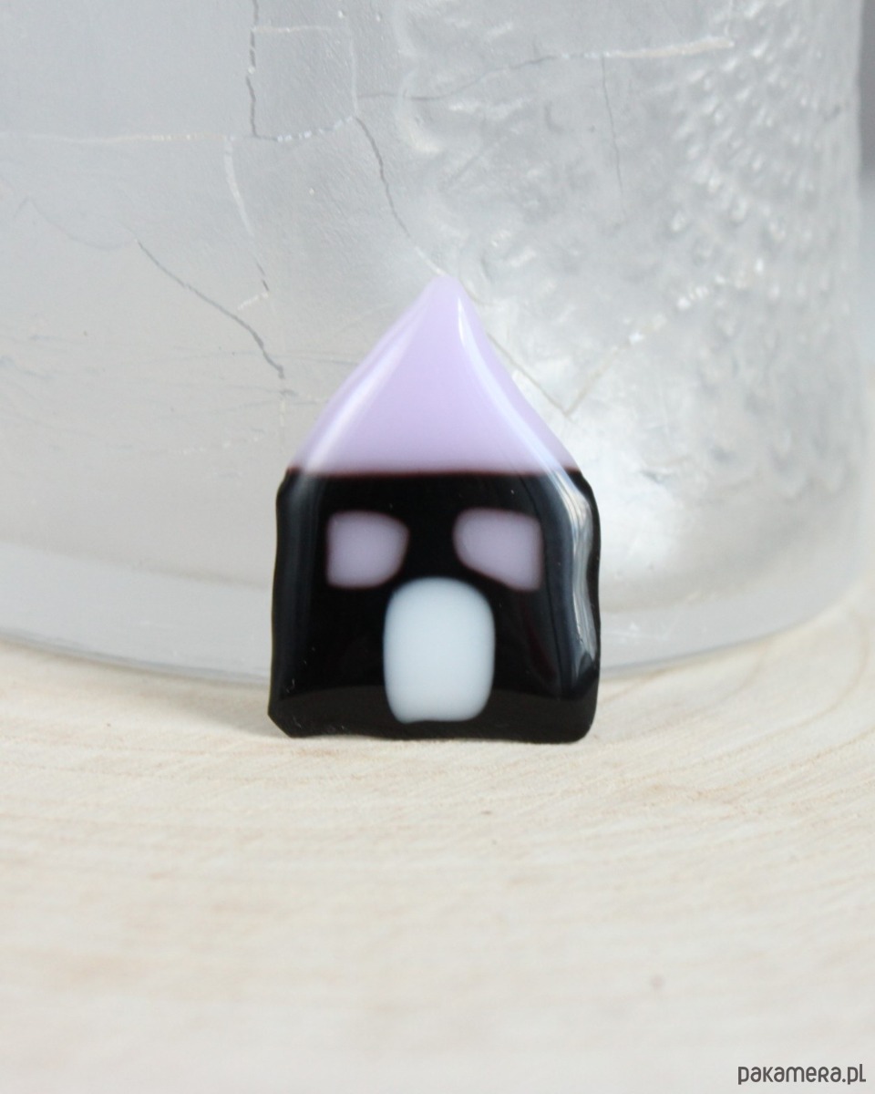 Szklana broszka, domek. Wymiary: 4,0cm x 3,0cm, kolory: czarny, liliowy, biały.