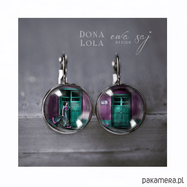 Oryginalne, zaczarowane, romantyczne kolczyki Miniaturki moich fotografii ukryte pod szklaną kopułą organicznego szkiełka. Długość kolczyków 3 cm średnica graficznej miniatury 18 mm. baza kolczyków w kolorze ciemnego srebra( gun metal )
