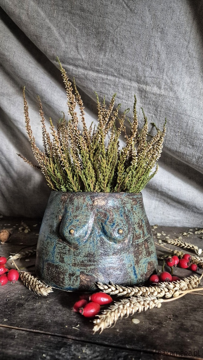 Doniczka, osłonka rzeźbiona Cycuszki. Kolory niebieskie, nocne kolory szkliwa, Rzeźba cycuszków. Doniczka kobieta. Szerokość ok. 20 cm, wysokość 17 cm. Nieprzemaklana. Wypał na 1230 stopni.