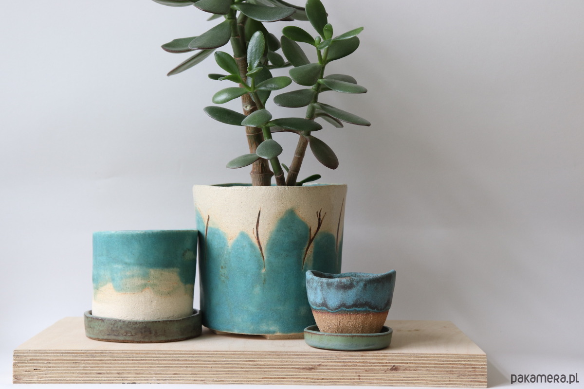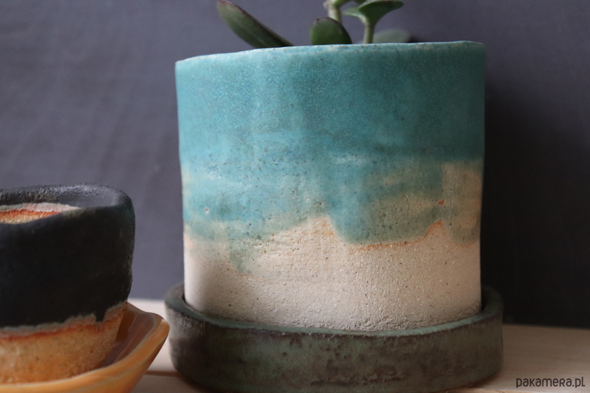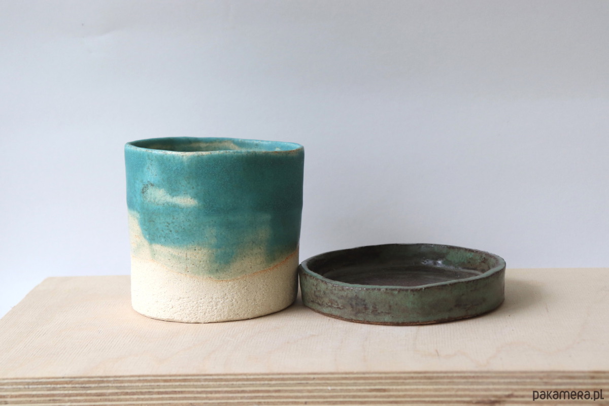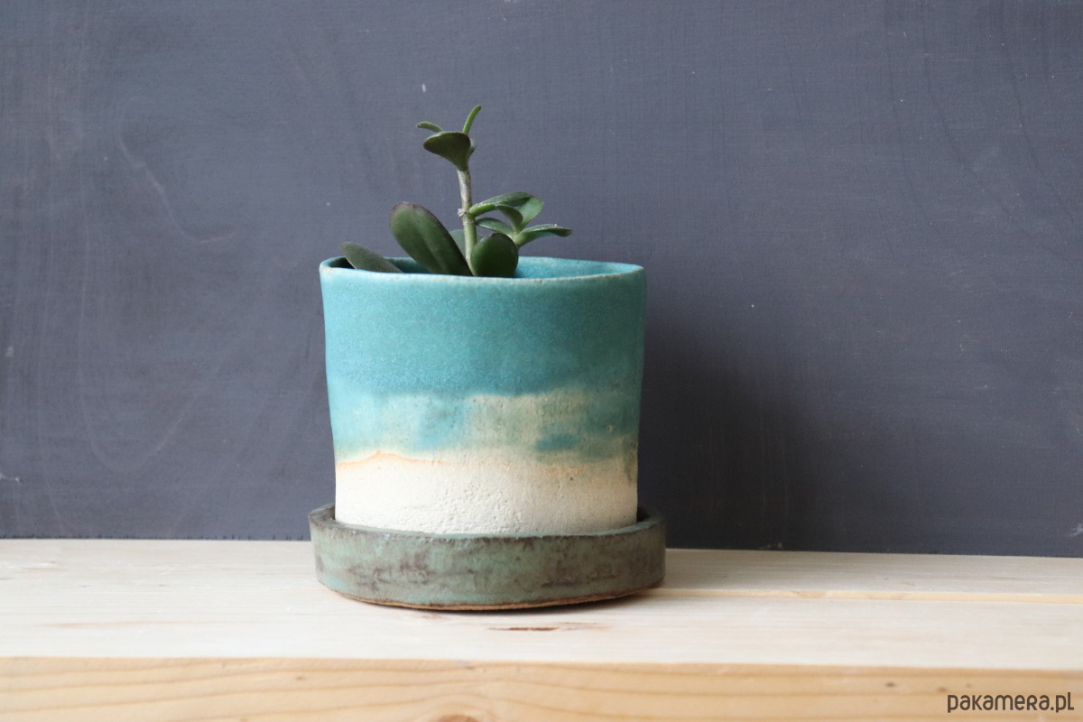 Doniczka wykonana z jasnej gliny, częściowo pokryta niebieskim szkliwem z przebarwieniami. Podstawka pokryta zielonym szkliwem z przebarwieniami.