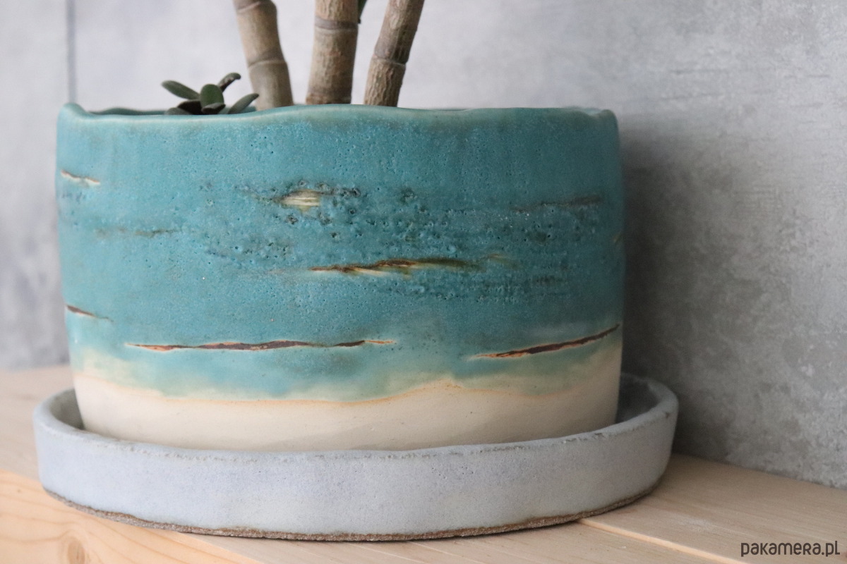 Doniczka wykonana z grubego płata jasnej gliny, częściowo pokryta niebieskim szkliwem z czarnymi smugami. Podstawka pokryta w całości jasnoszarym szkliwem z przebarwieniami.