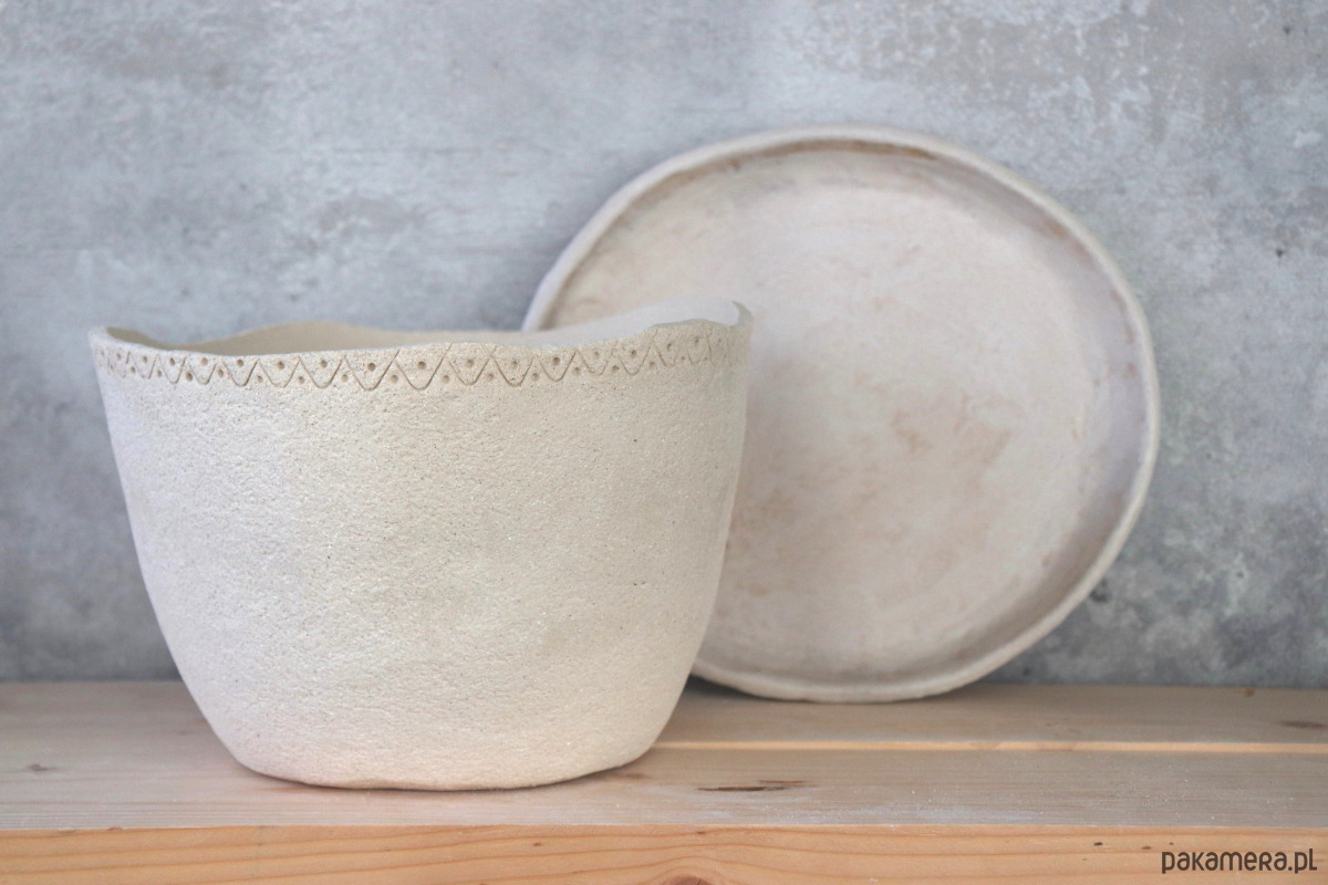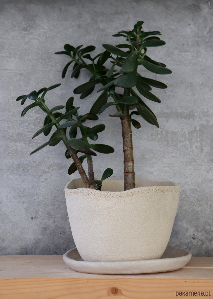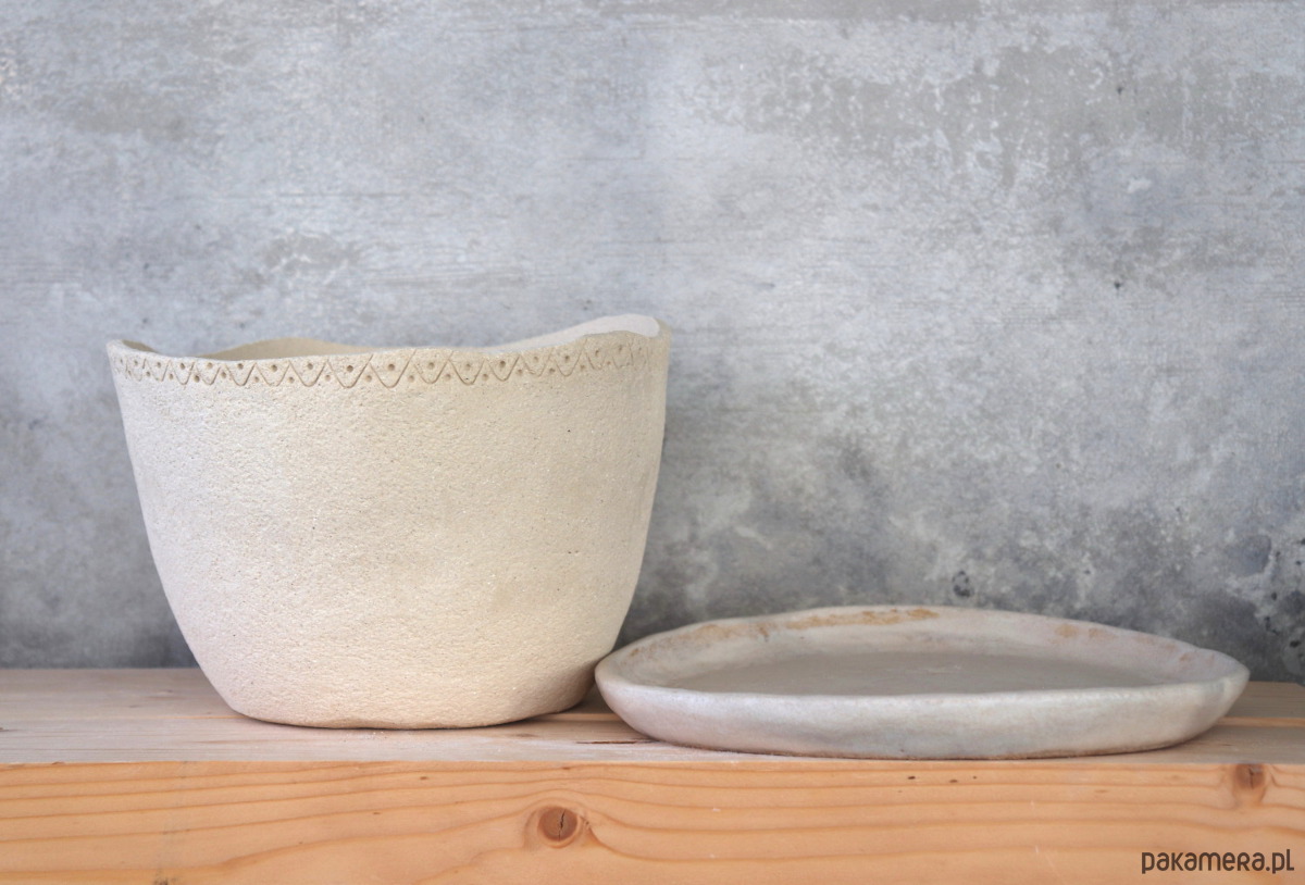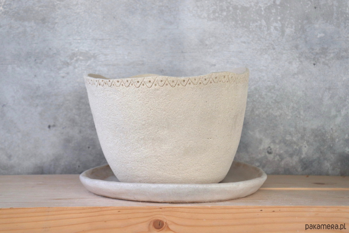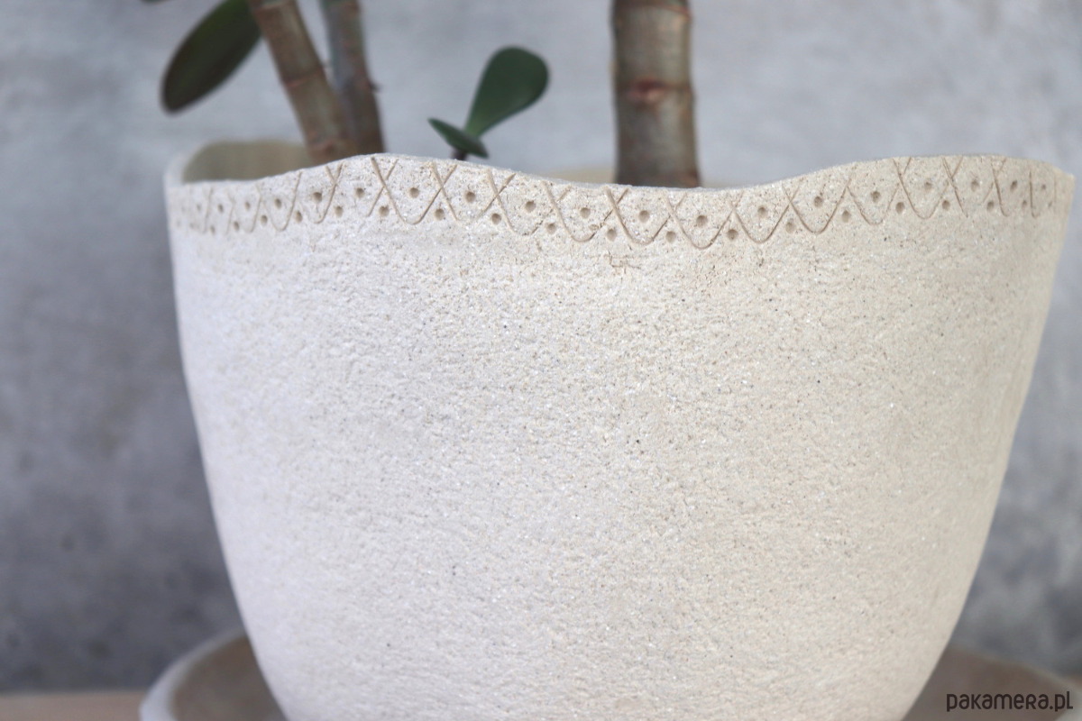 Doniczka wykonana z jasnokremowe, surowej gliny delikatnie zdobiona przy rancie. Podstawka w całości pokryta jest biało-beżowym szkliwem.