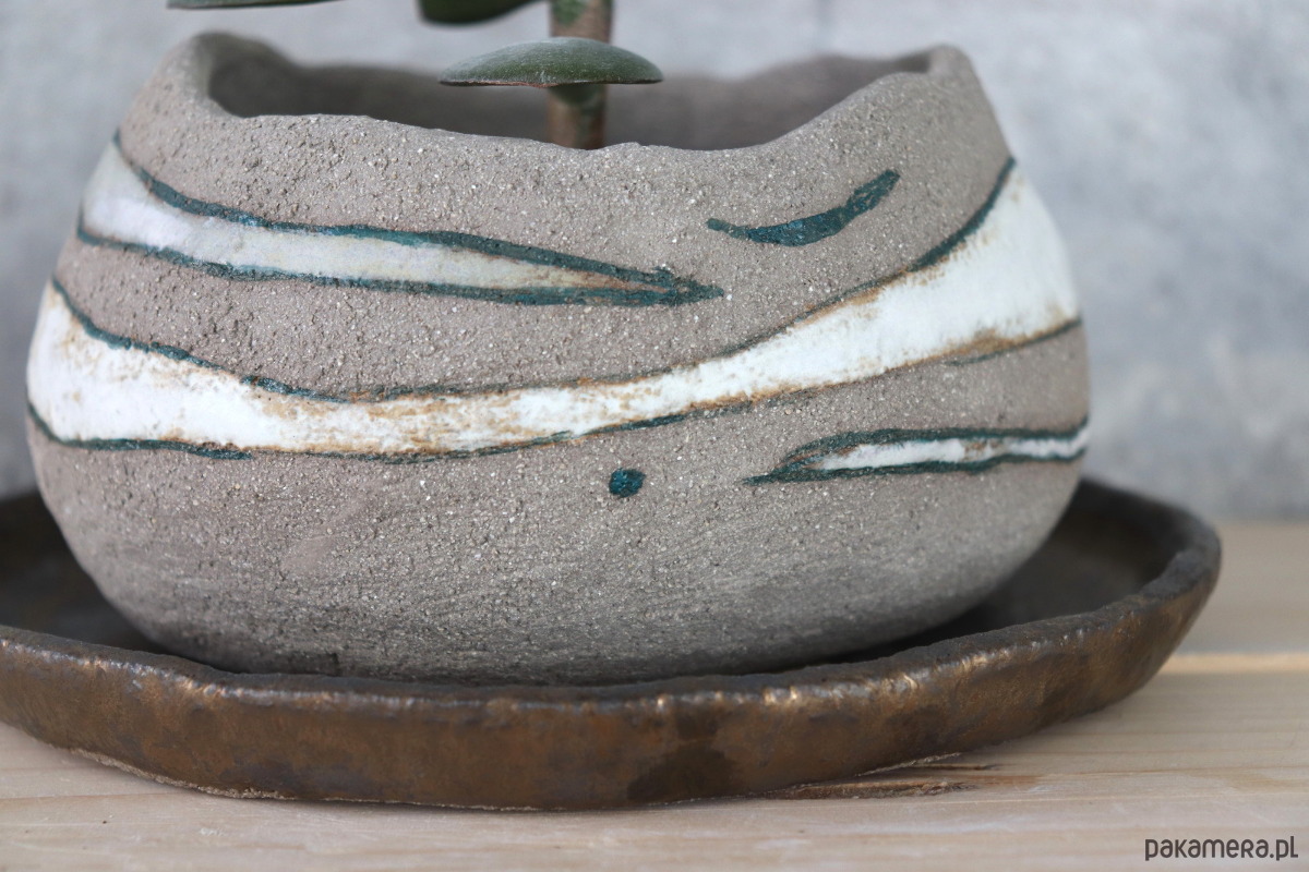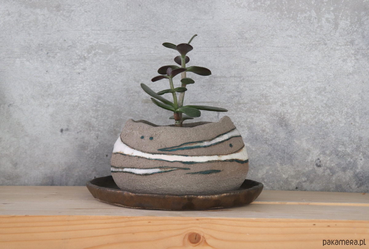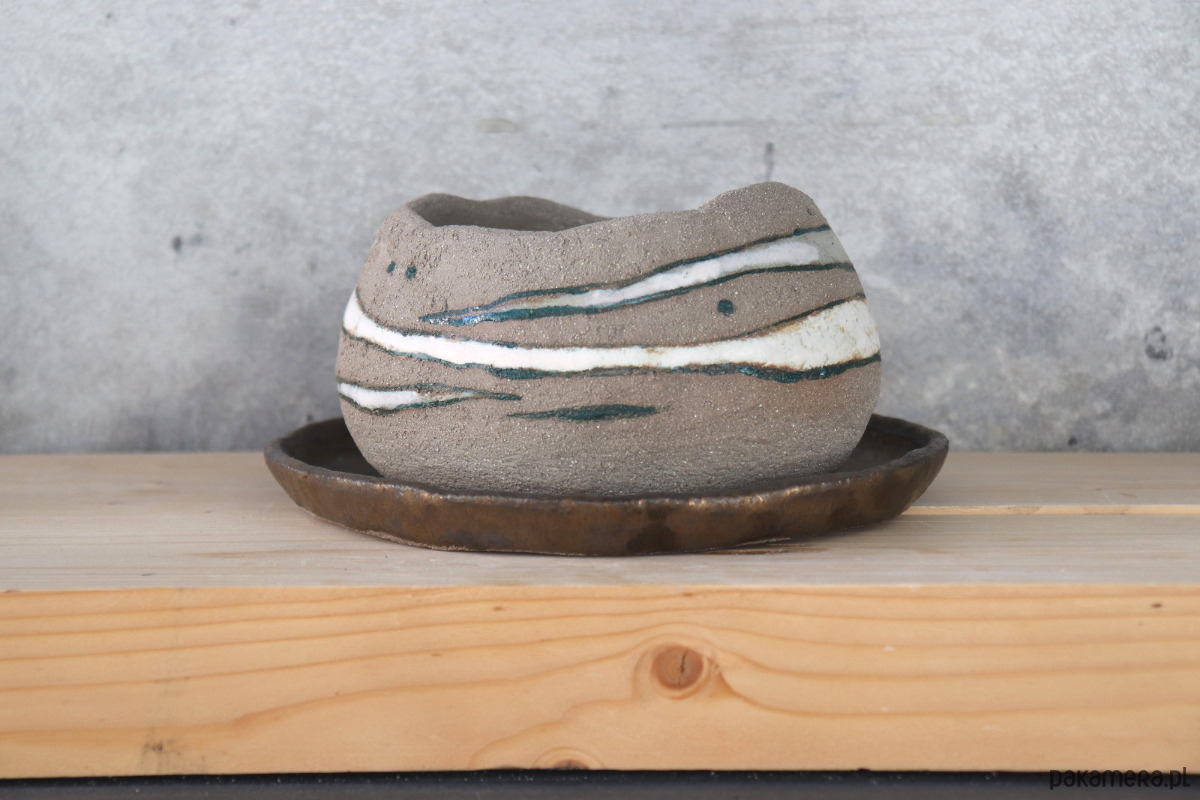 Doniczka z szarej, surowej gliny dekorowana muśnięciami białych szkliw i ciemnymi kreskami farby ceramicznej. Podstawka w całości pokryta szkliwem w kolorze starego złota.