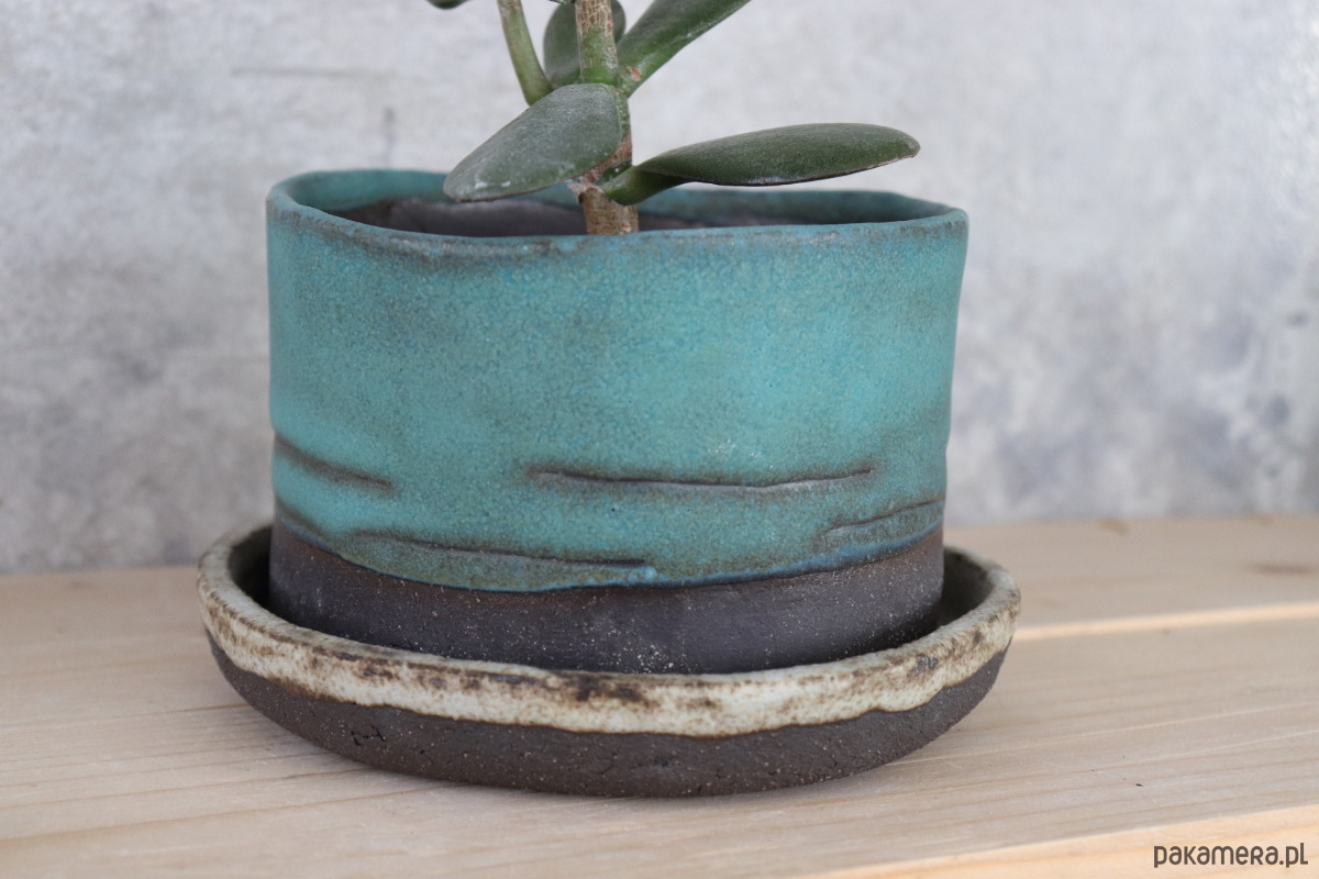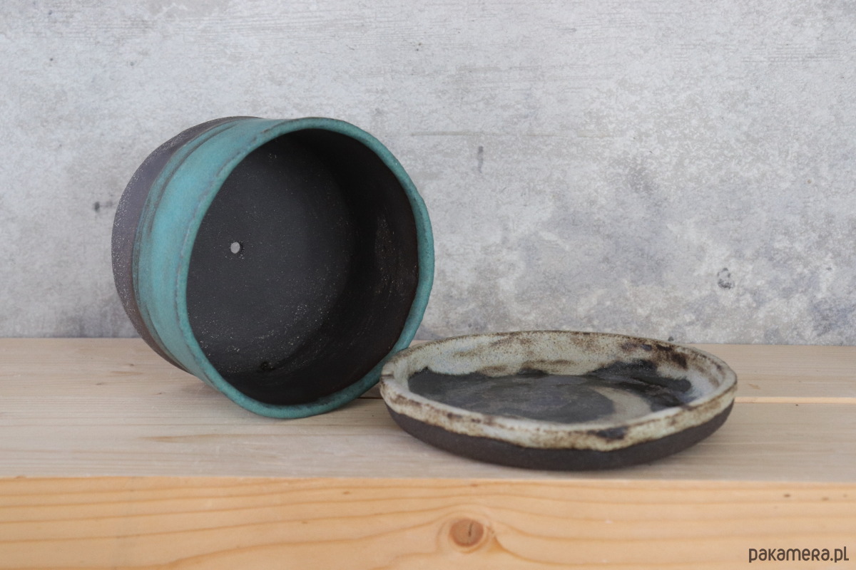 Doniczka wykonana z czarno-brązowej gliny z delikatnie widocznym szamotem, częściowo pokryta niebieskim szkliwem z delikatnymi przebarwienaimi. Podstawka malowana fioletowym i szarym szkliwem.