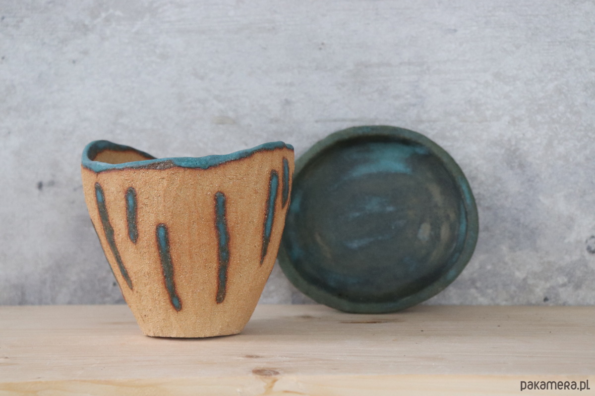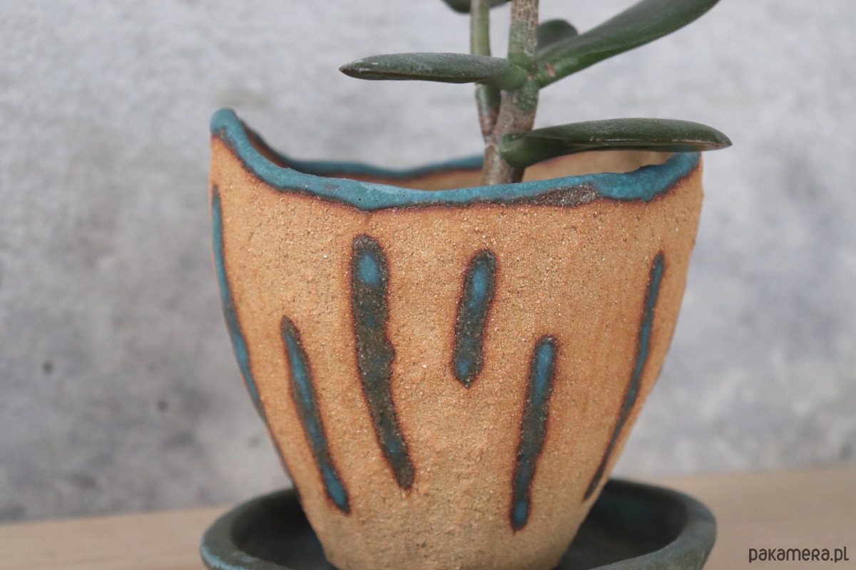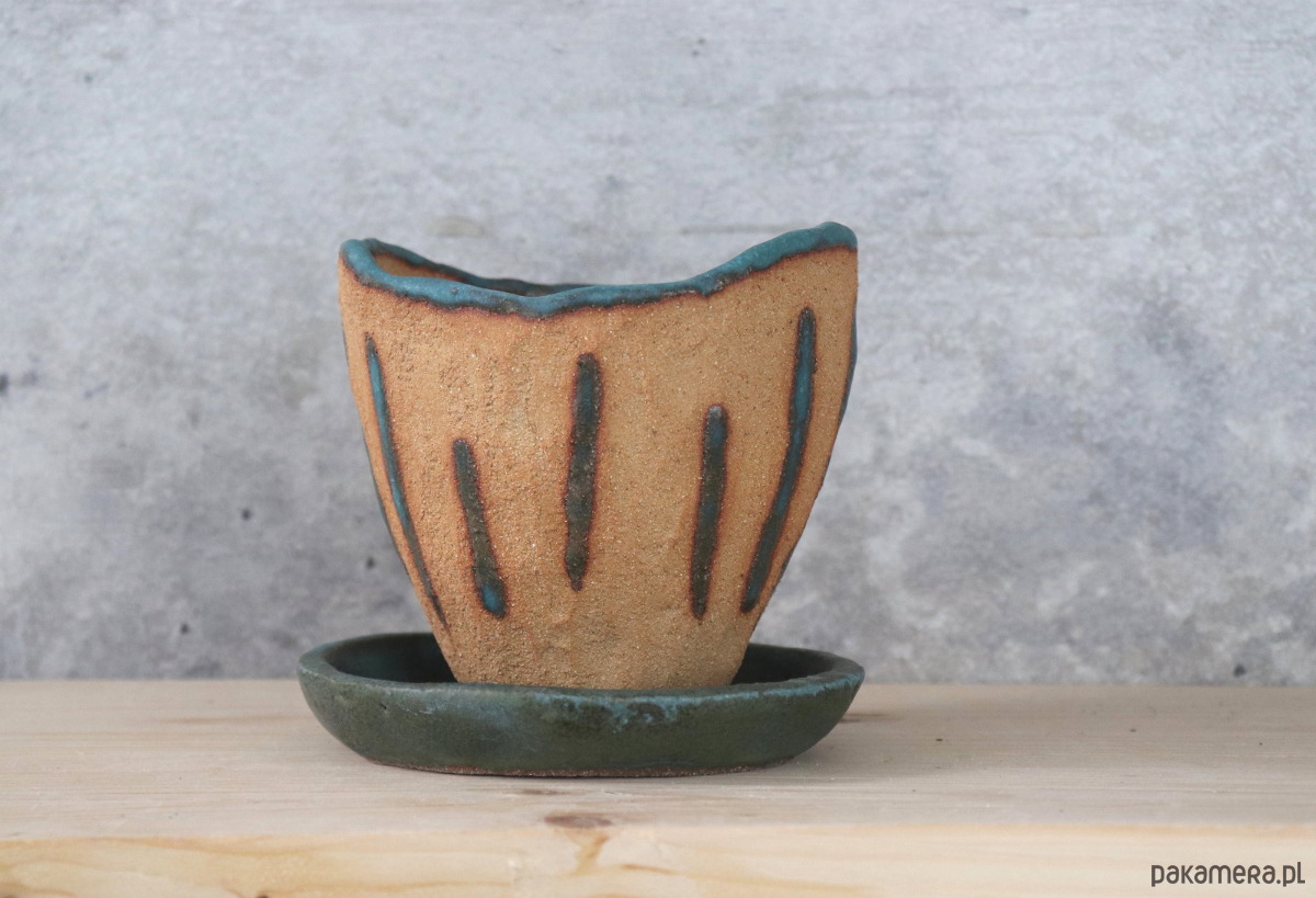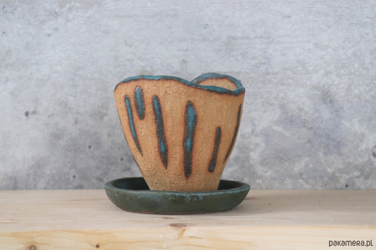 Doniczka wykonana z surowej, żółtej gliny miejscowo zdobiona szkliwami, podstawka w całości szkliwiona ciemnym szkliwem z przebarwieniami. Wzory na doniczce nie są powtarzalne, więc z każdej strony wygląda nieco inaczej. Naczynie zostało wykonane ręcznie, bez użycia koła garncarskiego.
