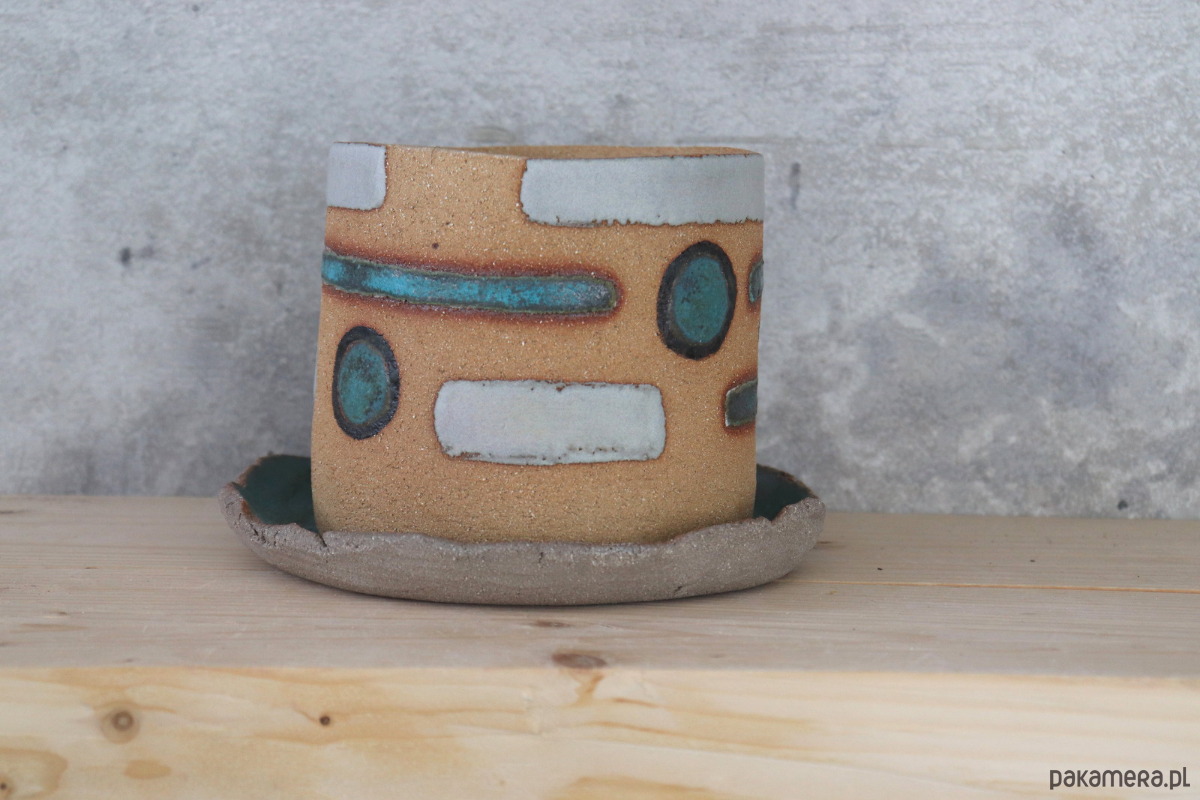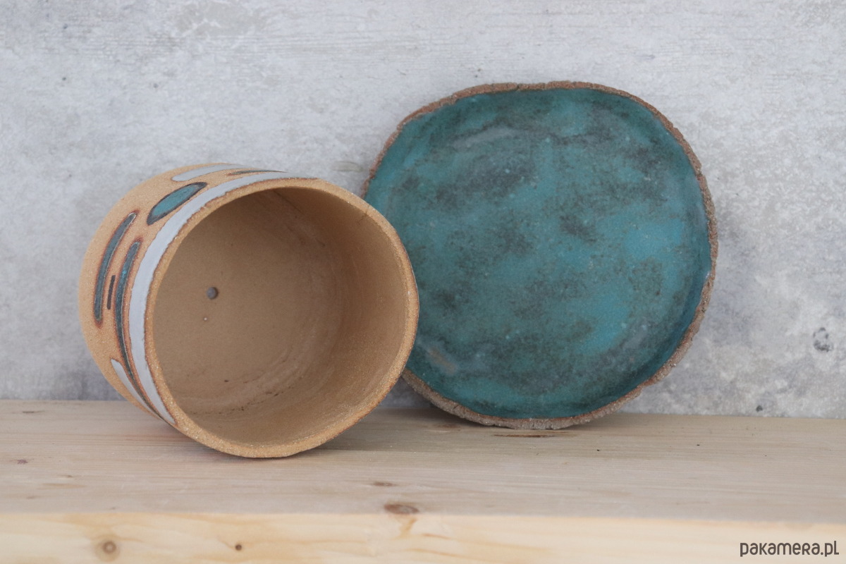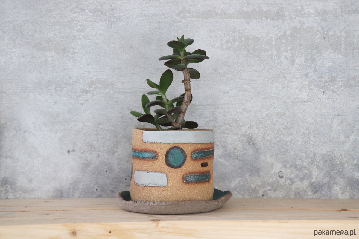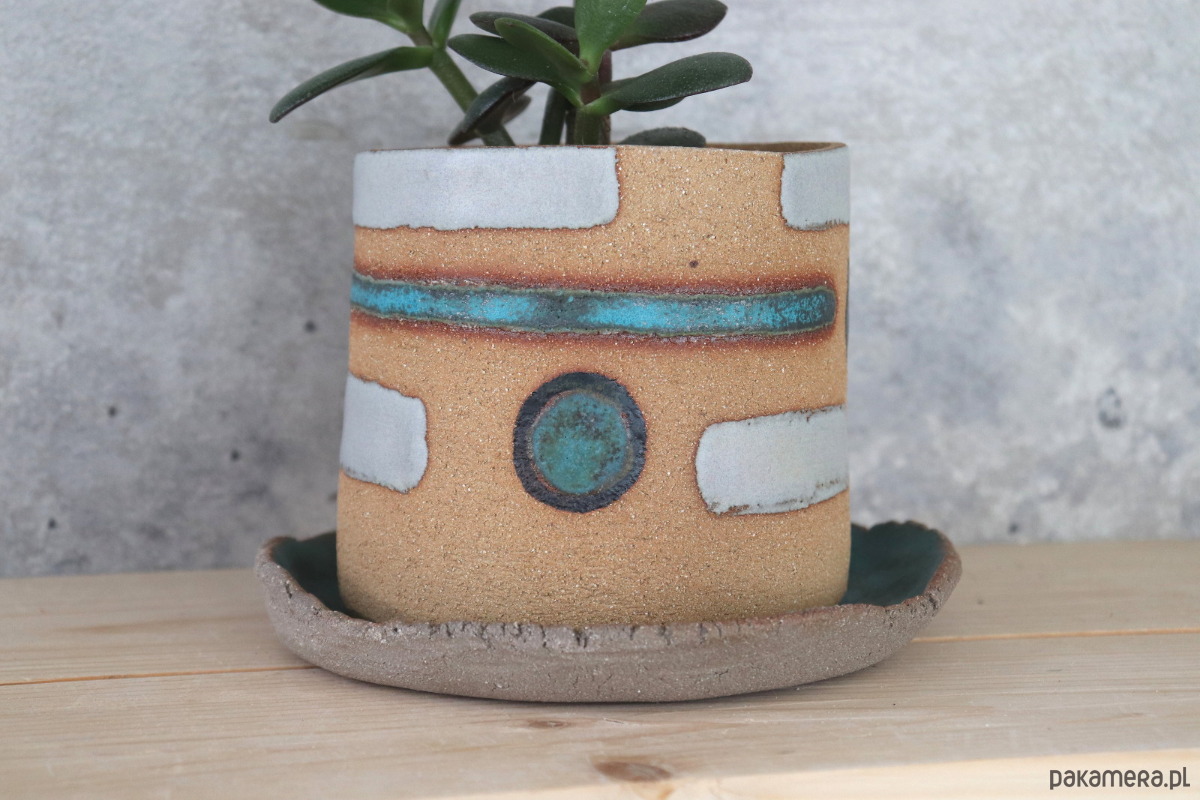Doniczka wykonana z surowej, żółtej gliny miejscowo zdobiona szkliwami, nieregularna podstawka z szarej gliny pokryta została we wnętrzu niebieskim szkliwem z przebarwieniami. Wzory na doniczce nie są powtarzalne, więc z każdej strony wygląda nieco inaczej. Naczynie zostało wykonane ręcznie, bez użycia koła garncarskiego.