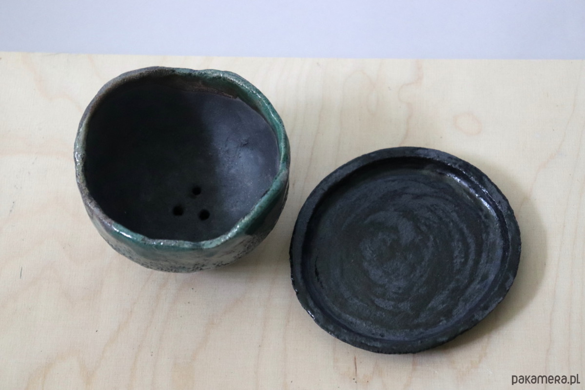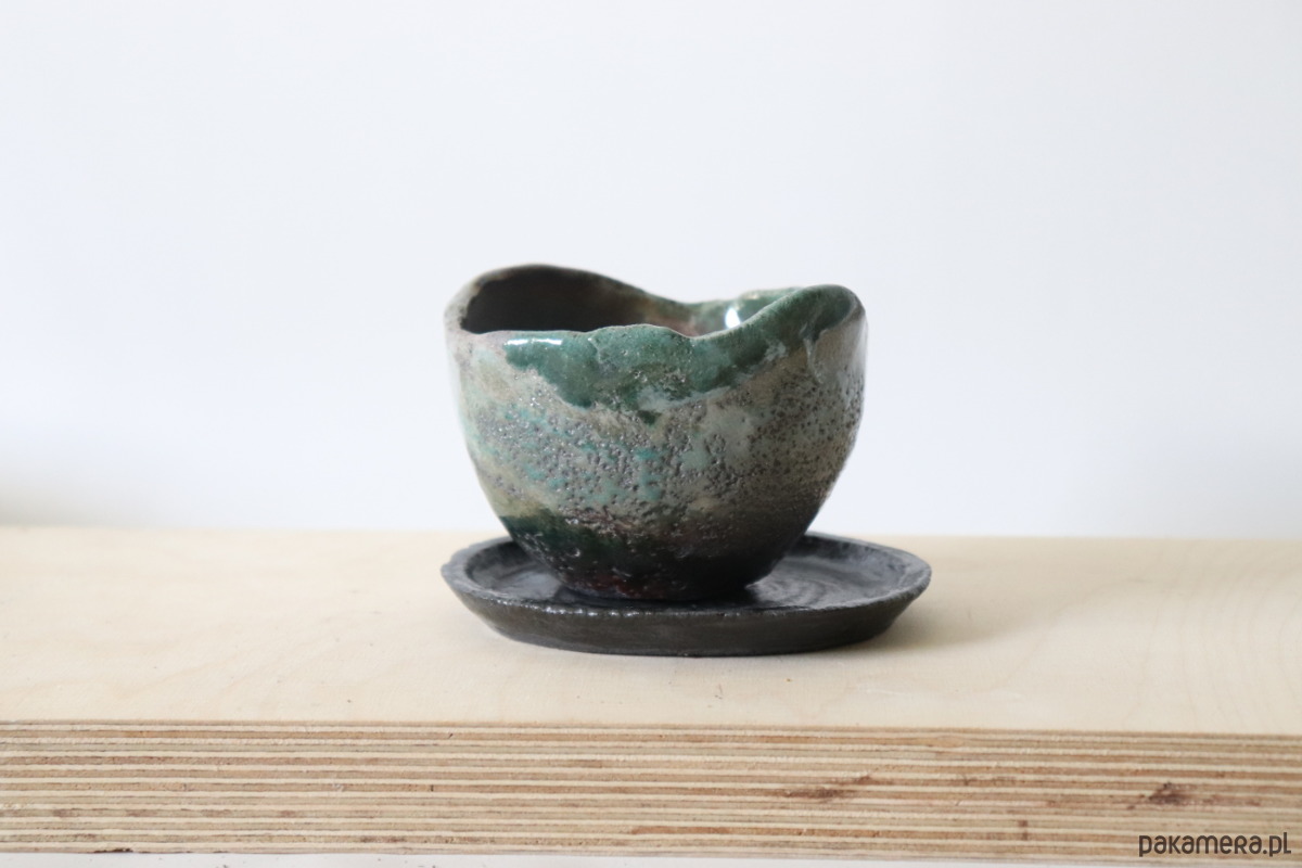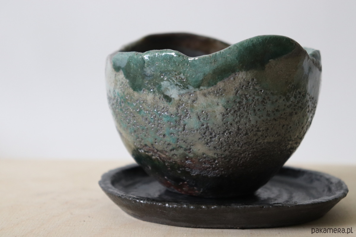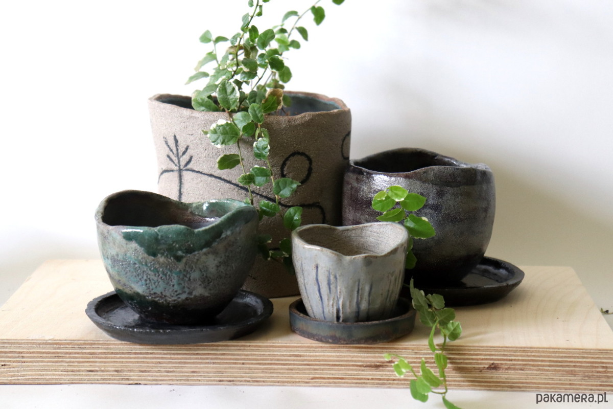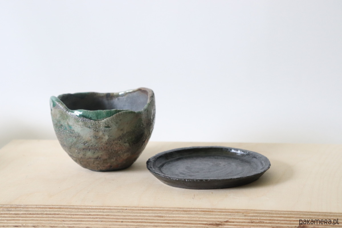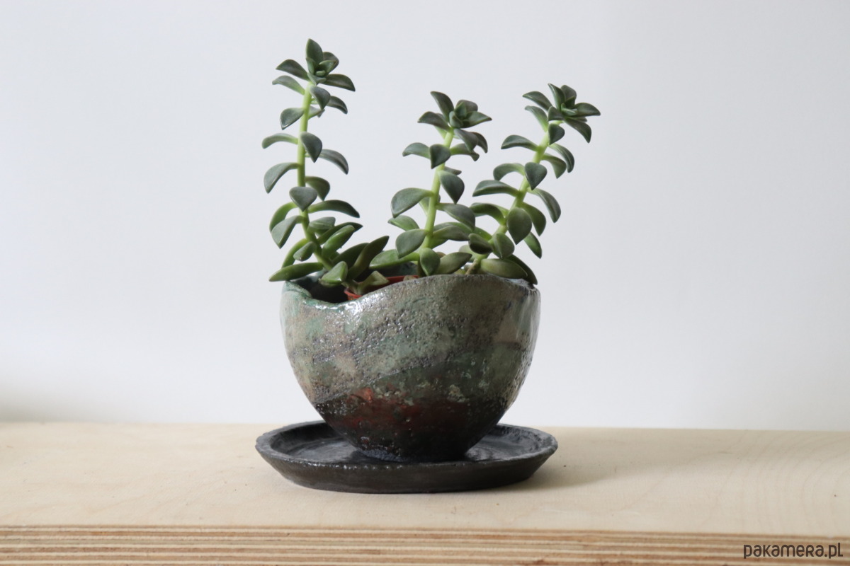 Doniczka wykonana z ciemnej gliny, pokryta szkliwem i wypalona techniką raku. Podstawka wypalona tradycyjną metodą w temperaturze 1240°C i pokryta ciemnym szkliwem.