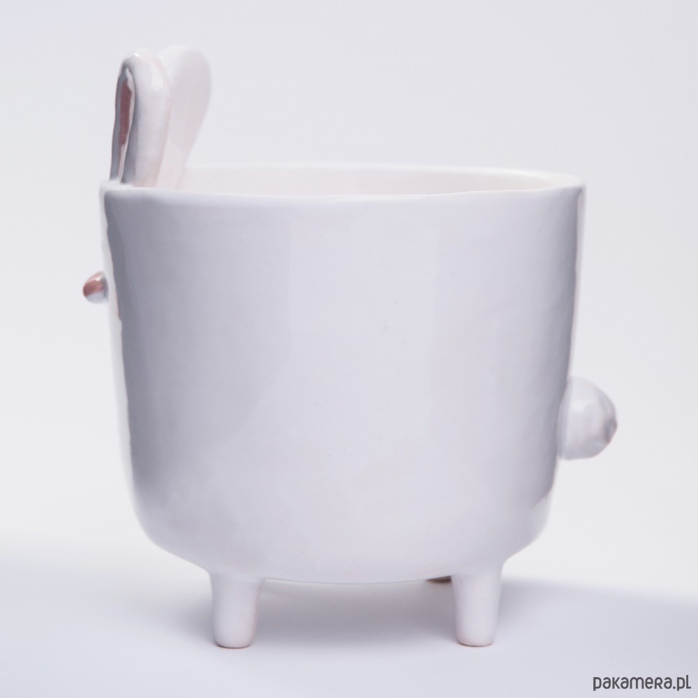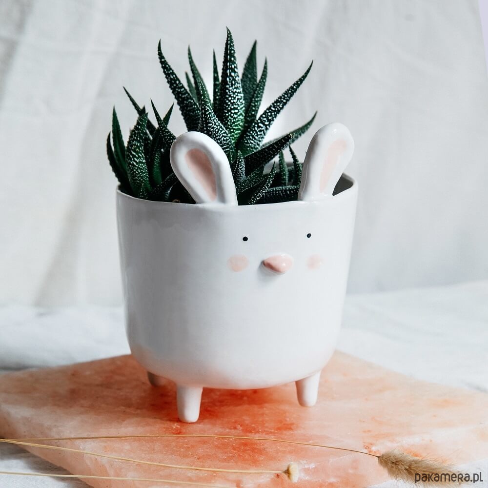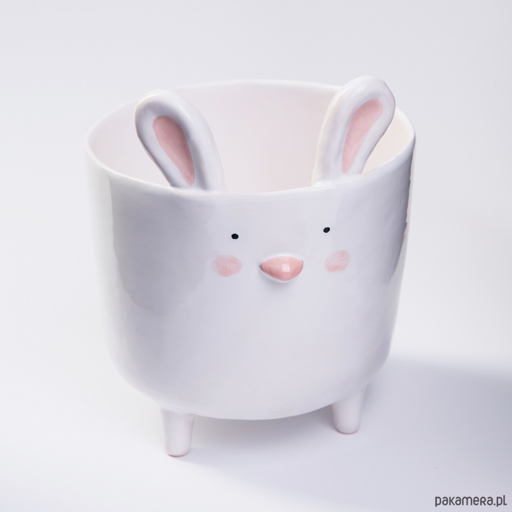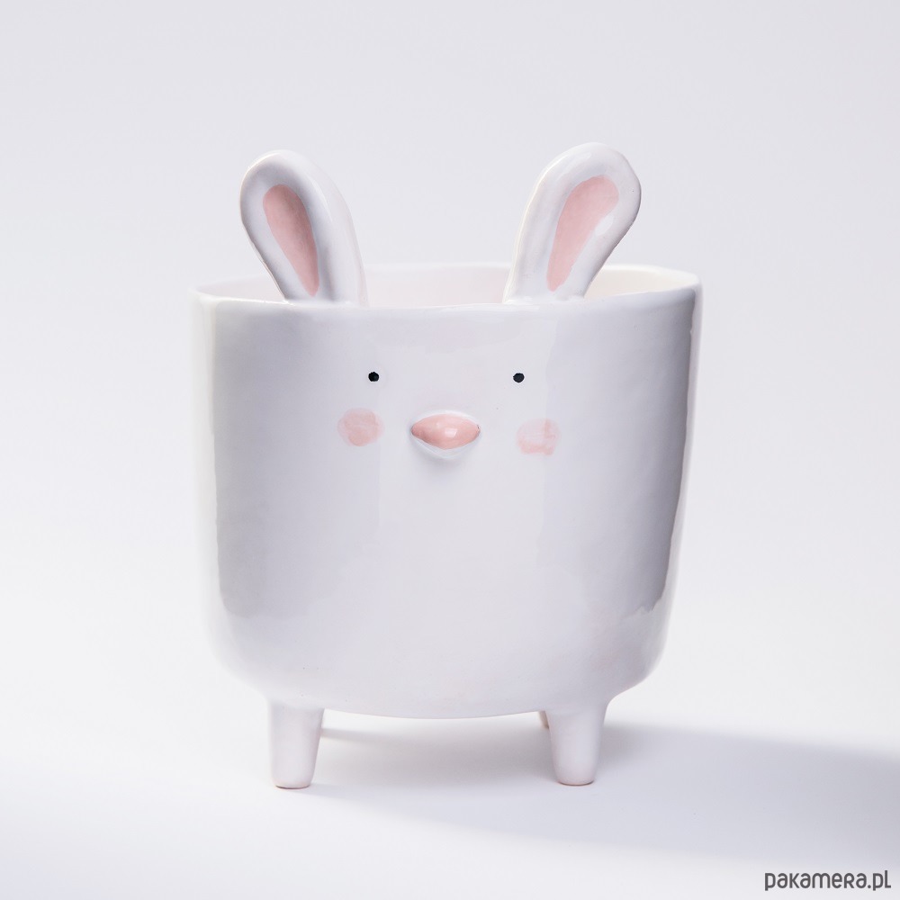 Ręcznie wykonana duża, ceramiczna doniczka w kształcie Królika Pitusia. Króliczek posiada stojące uszy, wypukły nosek oraz delikatnie zarumienione policzki. Z tyłu doniczki wystaje okrągły, króliczy ogonek.