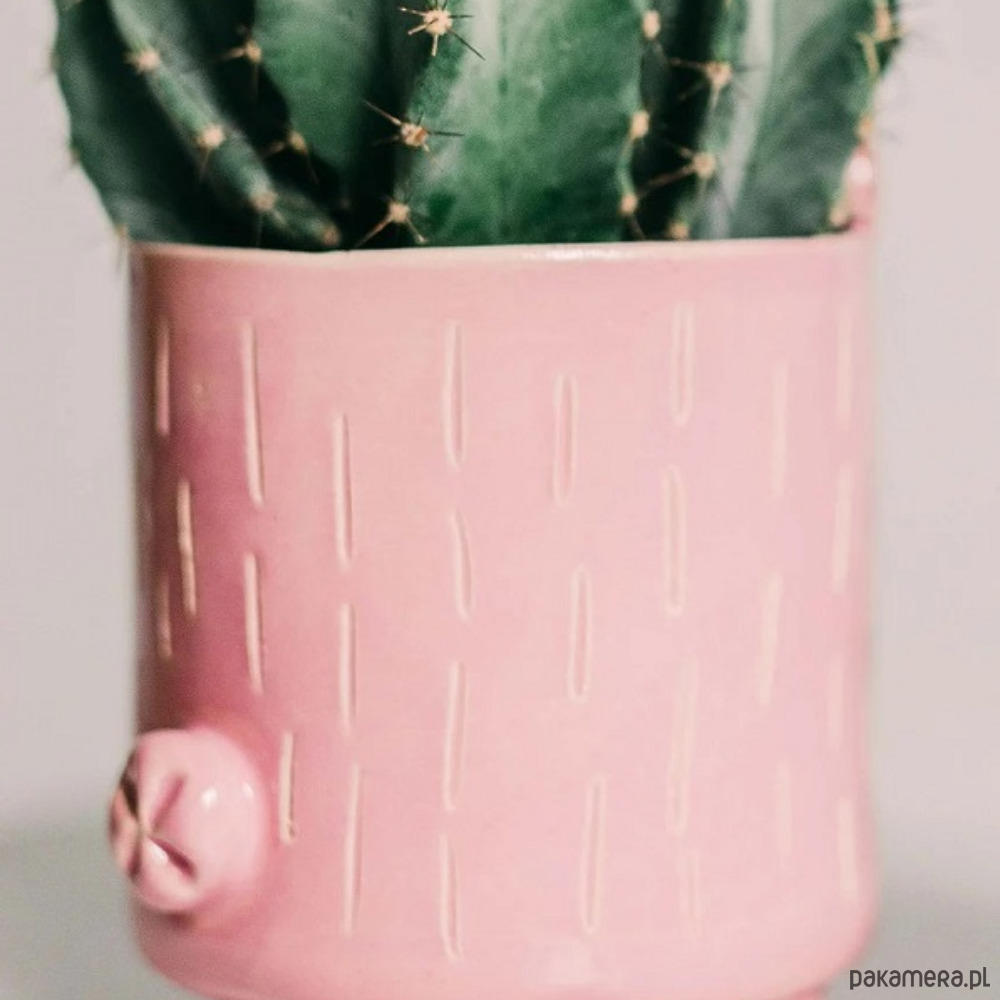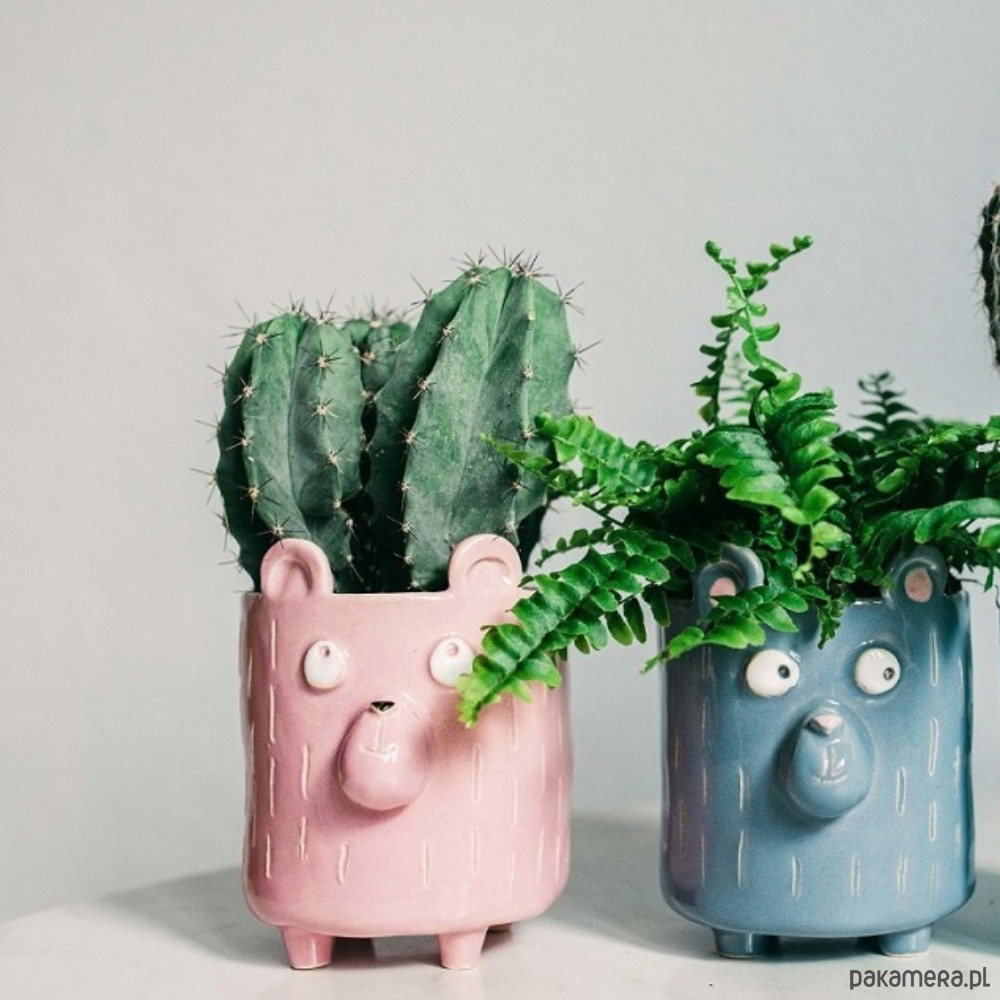 Ceramiczna, różowa doniczka w kształcie kreskówkowego Niedźwiadka . Osłonka wygląda wspaniale po skomponowaniu z ziołami, kaktusami, sukulentem lub inną rośliną. Może również służyć jako kubek, pojemnik lub głęboka miseczka.