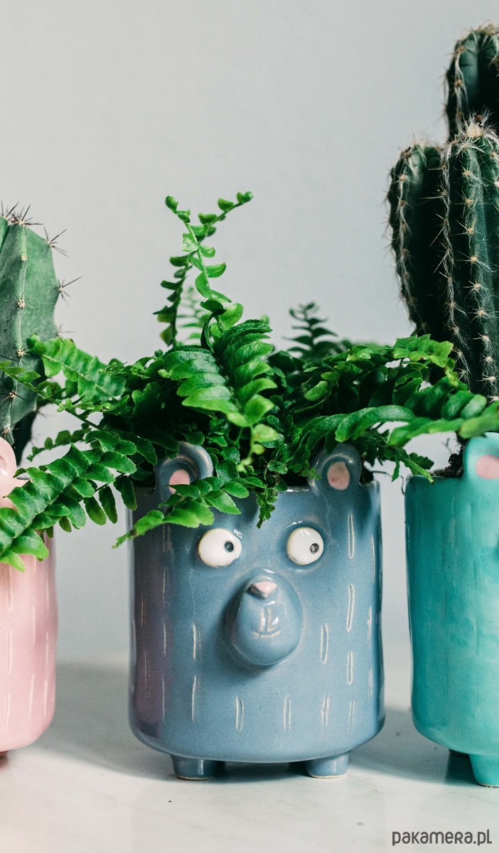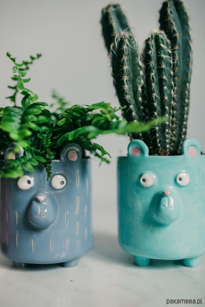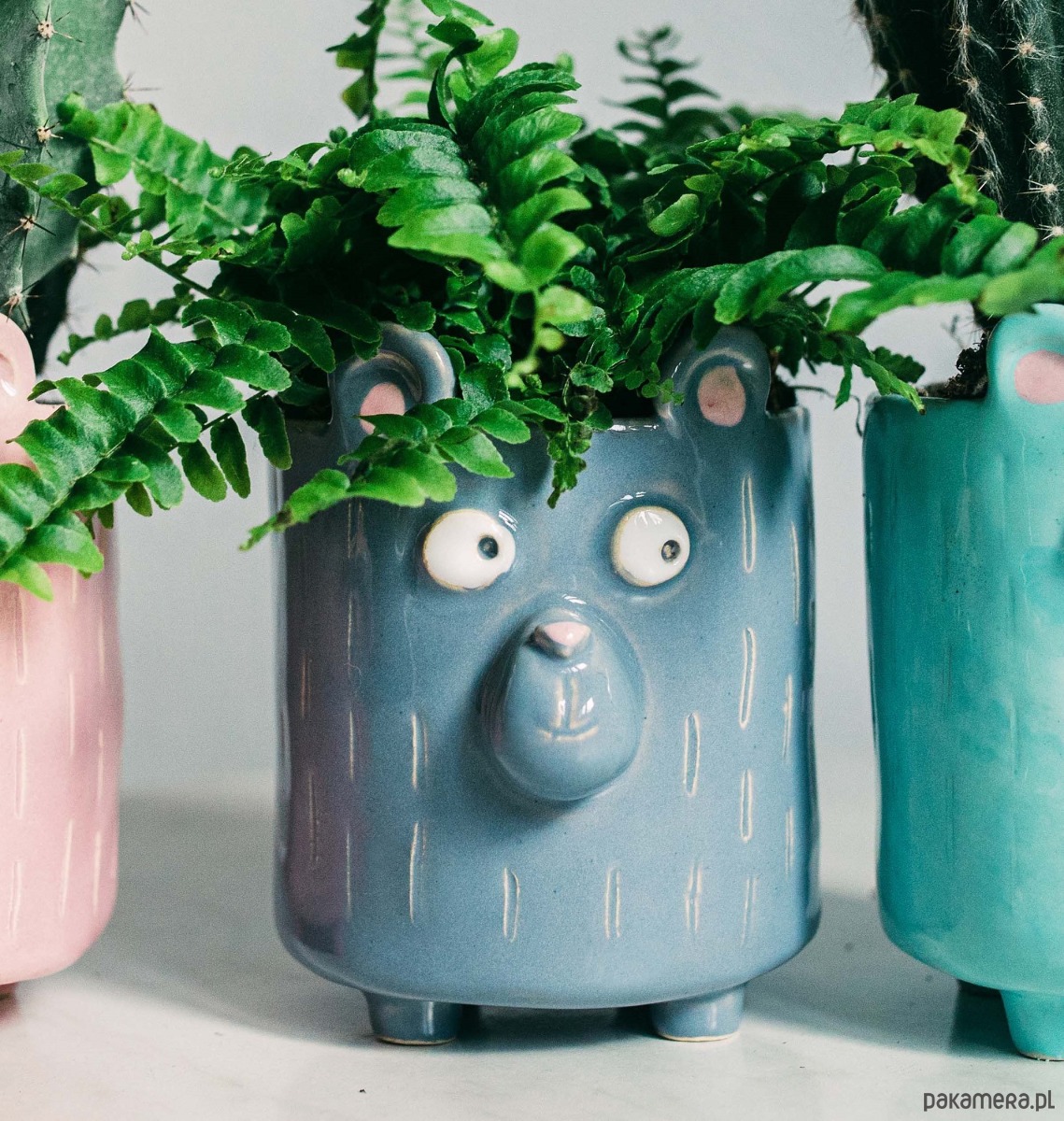 Ceramiczna doniczka w kształcie kreskówkowego Niedźwiadka . Osłonka wygląda wspaniale po skomponowaniu z ziołami, kaktusami, sukulentem lub inną rośliną. Może również służyć jako kubek, pojemnik lub głęboka miseczka.
