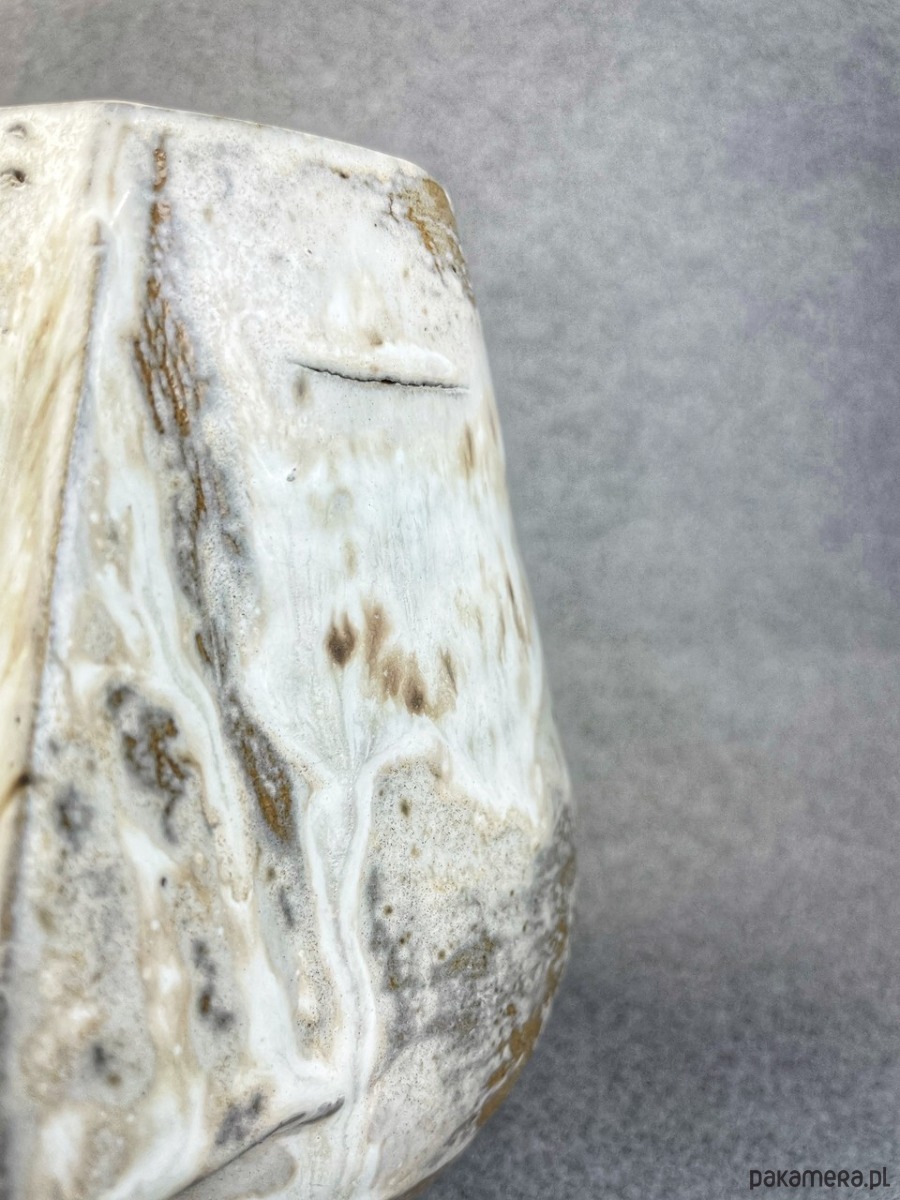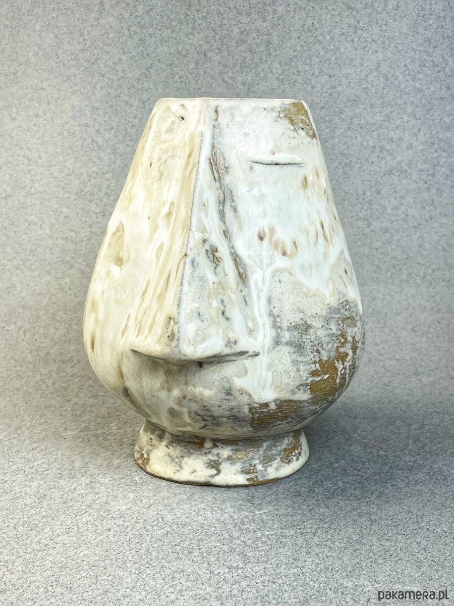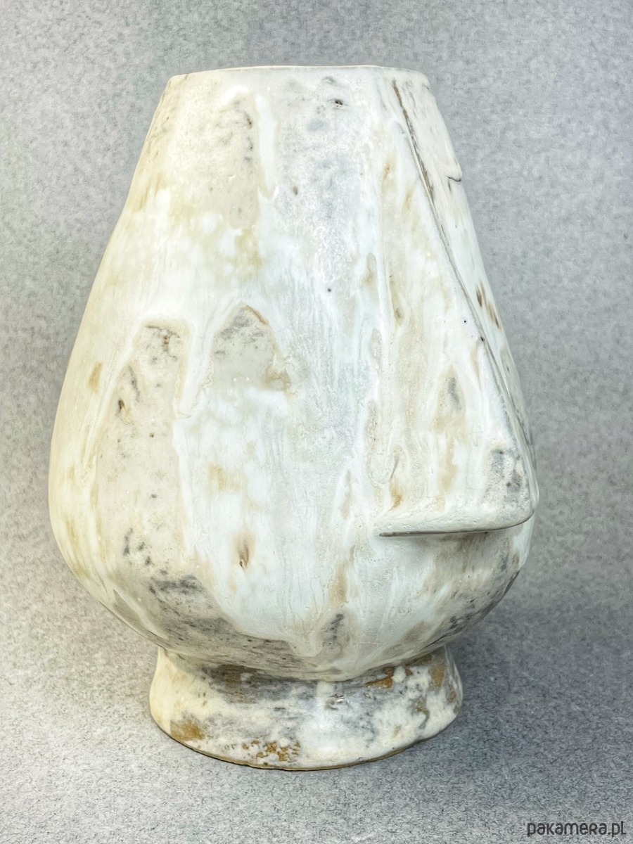 Wykonany z beżowej gliny pokryty beżowym, satynowym, efektowym szkliwem.