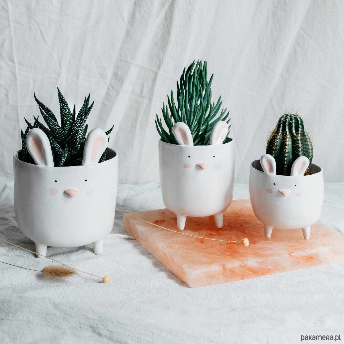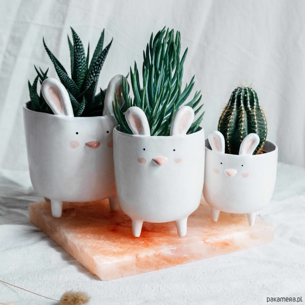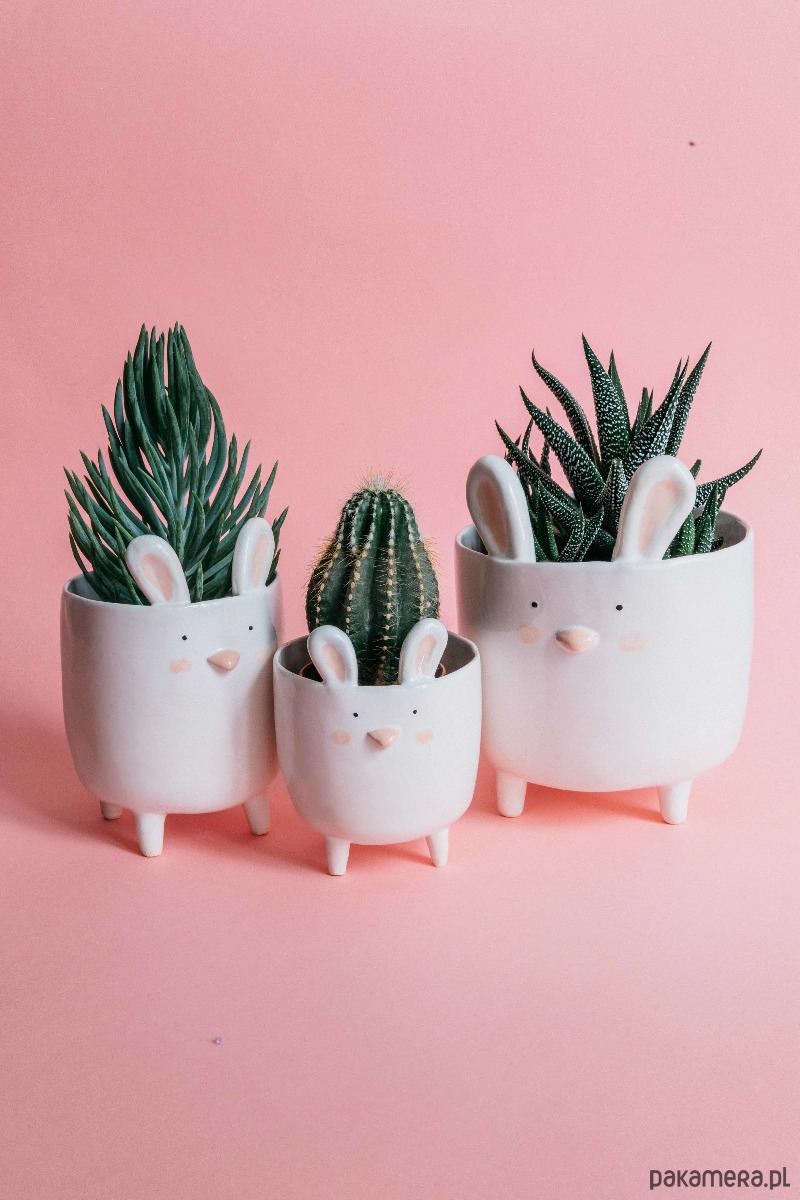 Zestaw trzech ręcznie wykonanych doniczek w kształcie królika. Każdy króliczek posiada stojące uszy, wypukły nosek oraz delikatnie zarumienione policzki. Z tyłu doniczki wystaje okrągły, króliczy ogonek. Zestaw zawiera po jednym króliczku w trzech rozmiarach: S,M,L.