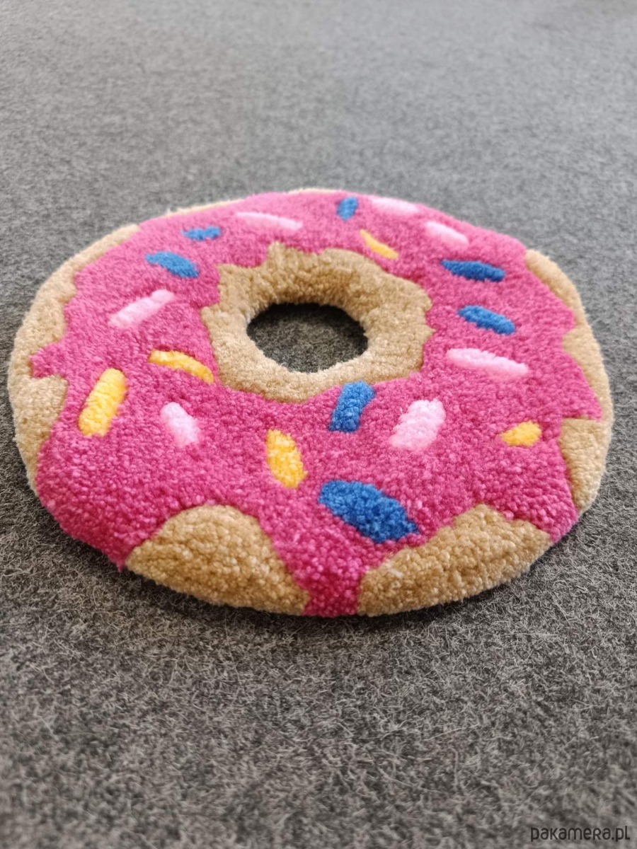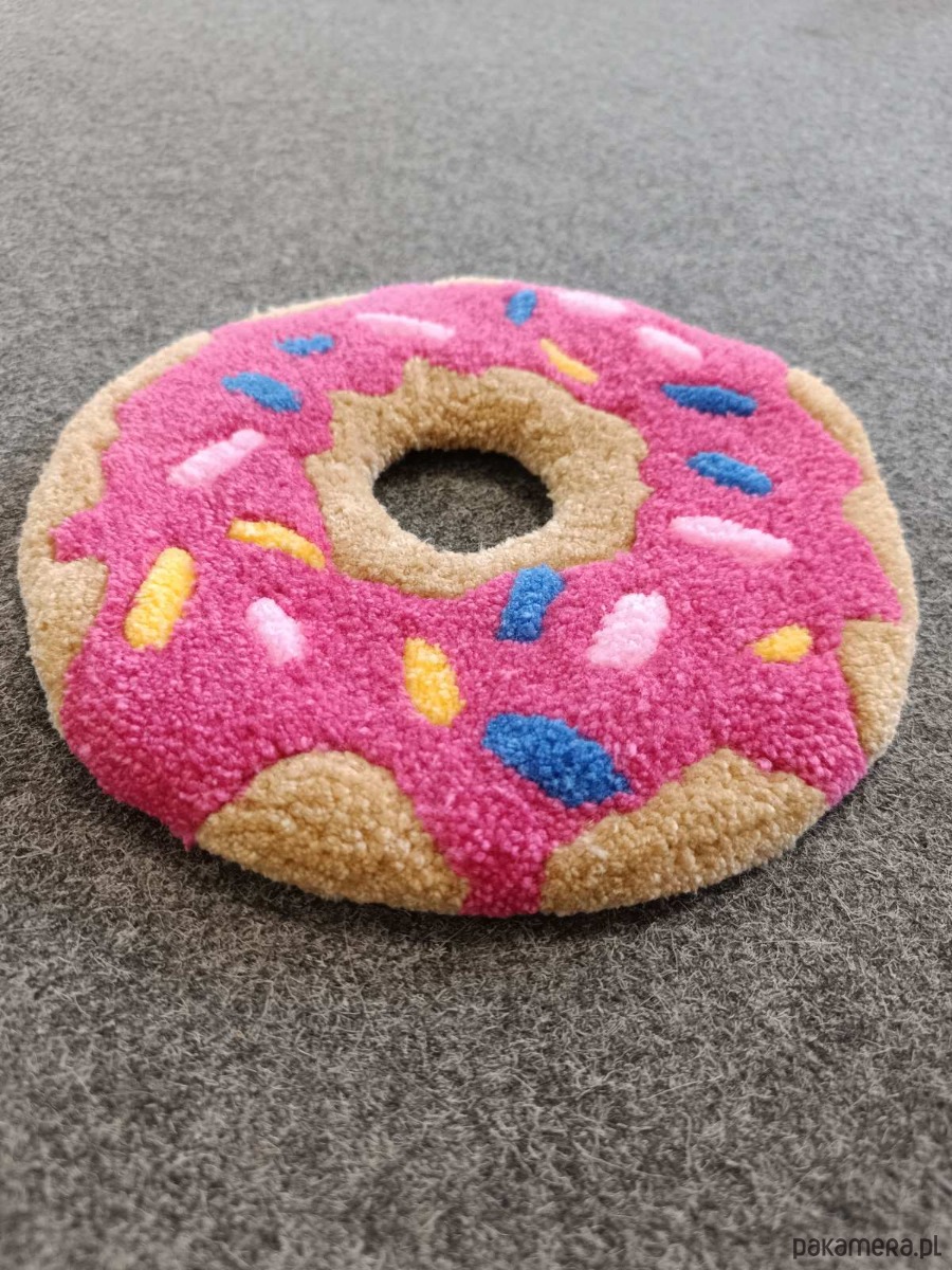 Ten dywan z pewnością poprawi ci humor. Uroczy dywan w kształcie donuta pączka z różową polewą i posypką. Jest miękki i miły w dotyku, można zamówić w dwóch wersjach: 40cm oraz 80cm. Ma zdjęciu widzimy dywan donut 40cm.