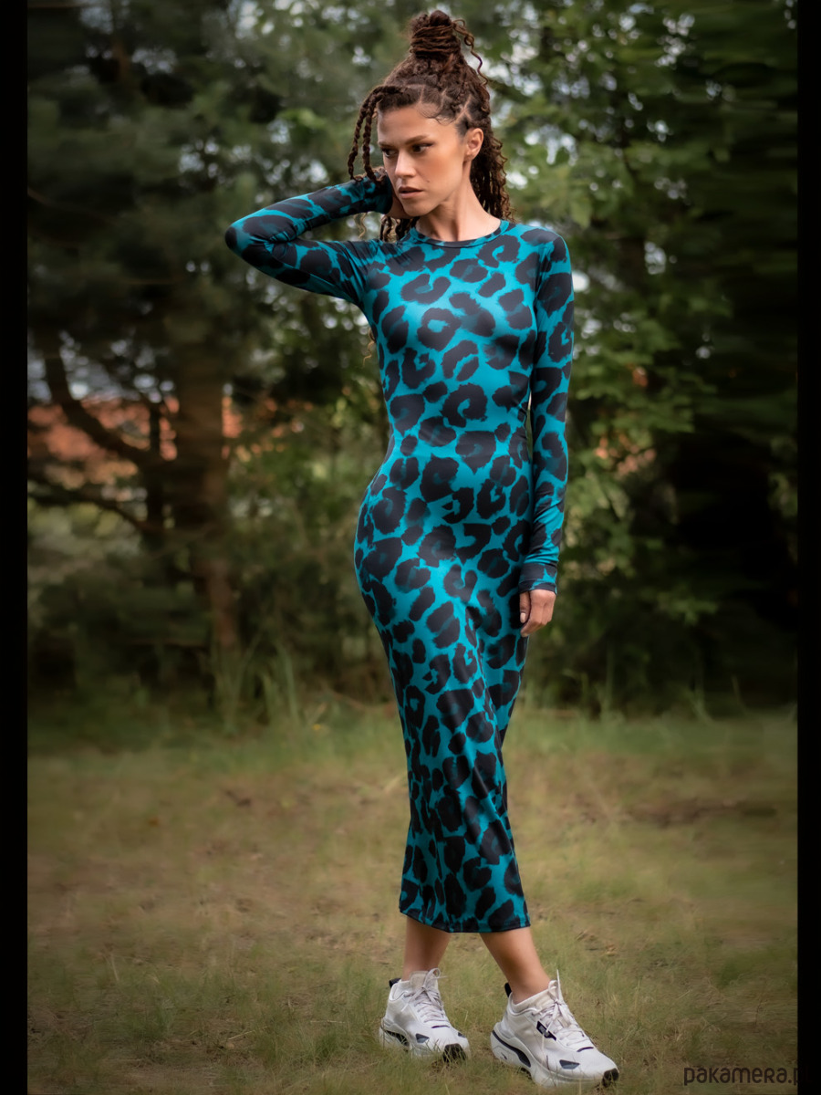 Zanurz się w energetyczny turkus z dzikim akcentem. Ta dopasowana sukienka o długości 7/8 to połączenie zmysłowej sylwetki i autorskiego printu.