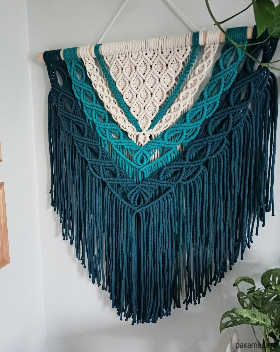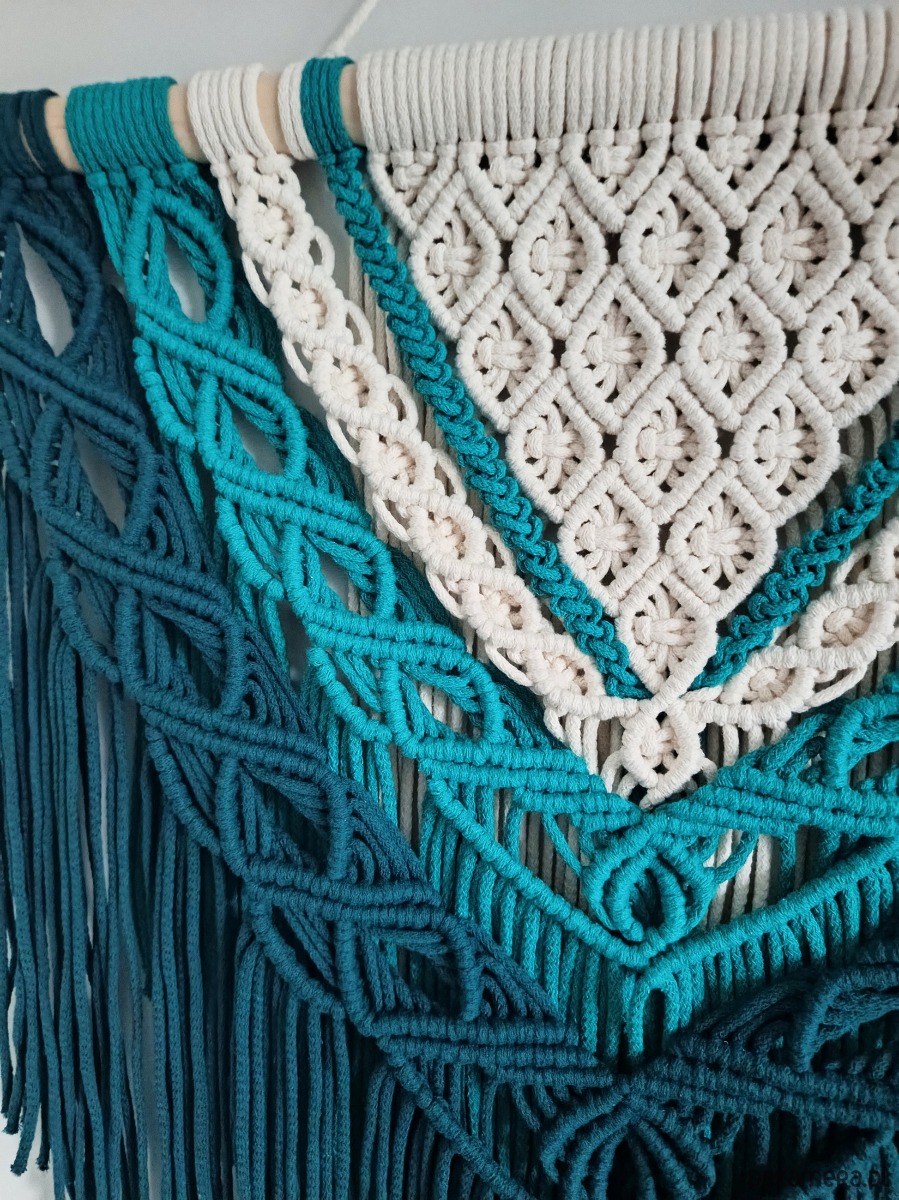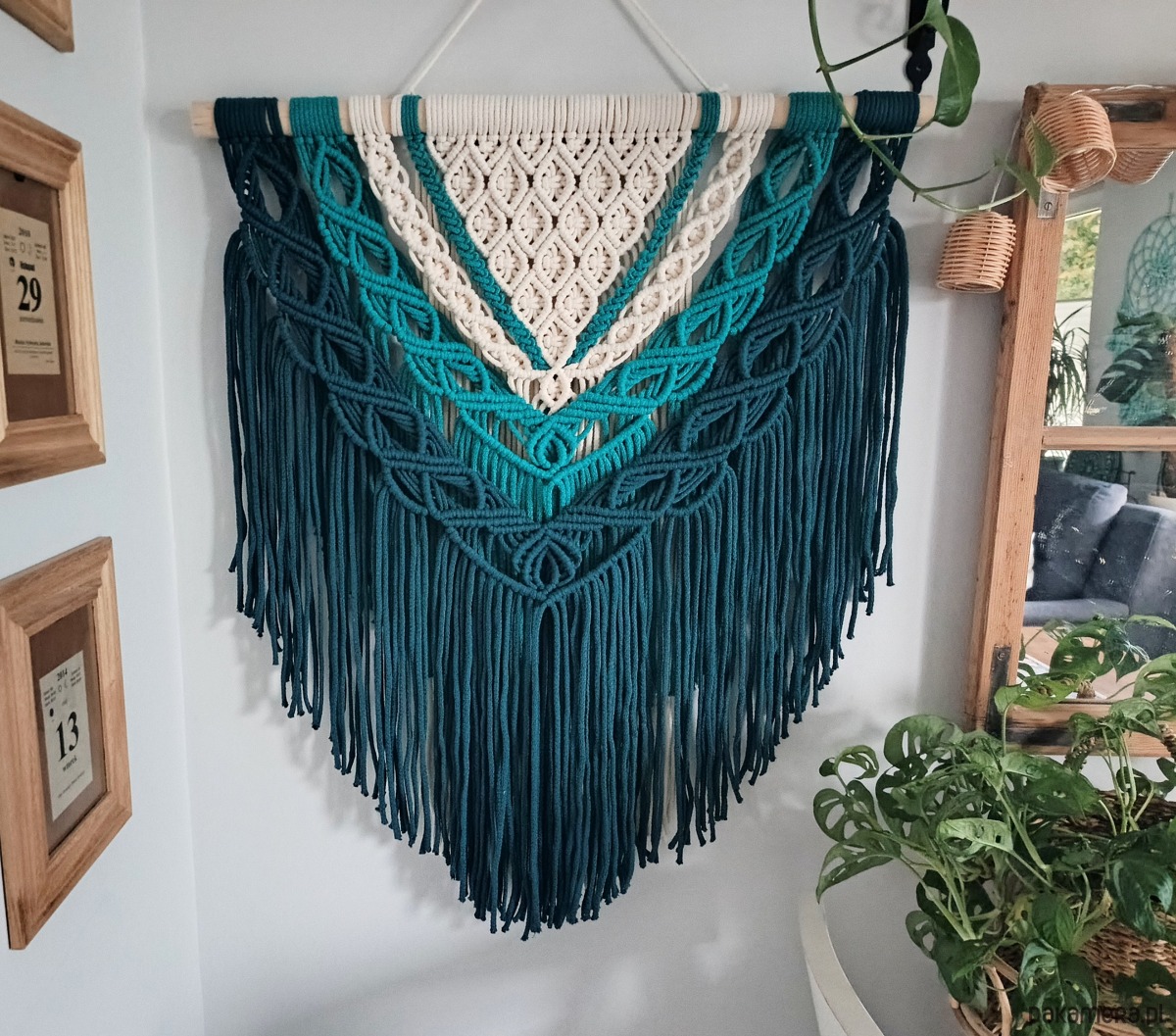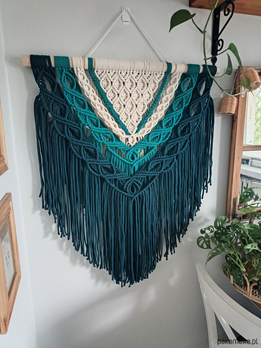 Makrama w 3 nadmorskich kolorach poleca się na ścianę:) Mamy tu jasny ecru, lazur i kolor morski- wszystko skomponowane w jedną estetyczną całość.