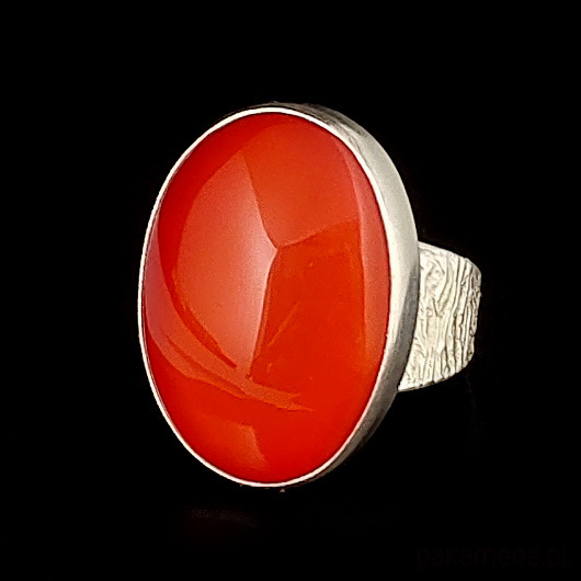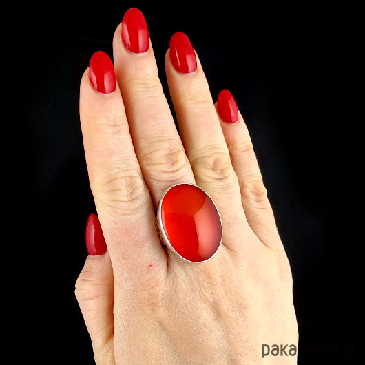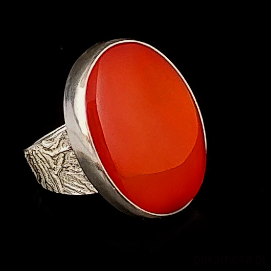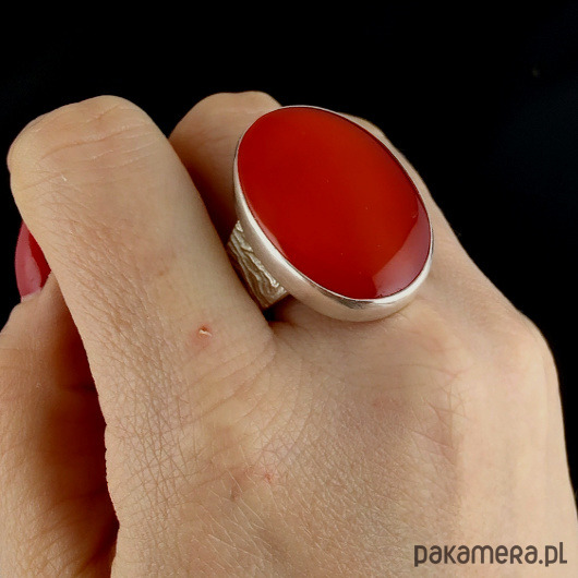 Pierścionek wykonany własnoręcznie ze srebra próby 925 oraz zjawiskowego karneolu. Trudny do opisania piękny kolor kamienia, czerwony z pomarańczową poświatę, pięknie współgra z blaskiem srebra. Wymiary oprawy 32 x 22mm. Waga 15 g. Rozmiar jubilerski 24, mogę powiększyć do rozmiaru max. 25. Pierścionek wysyłamy w ozdobnym pudełeczku. Polecam z pięknym wisiorem.
