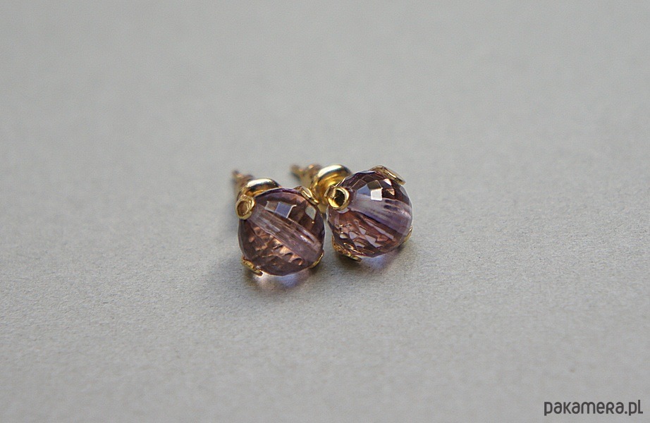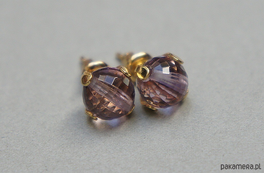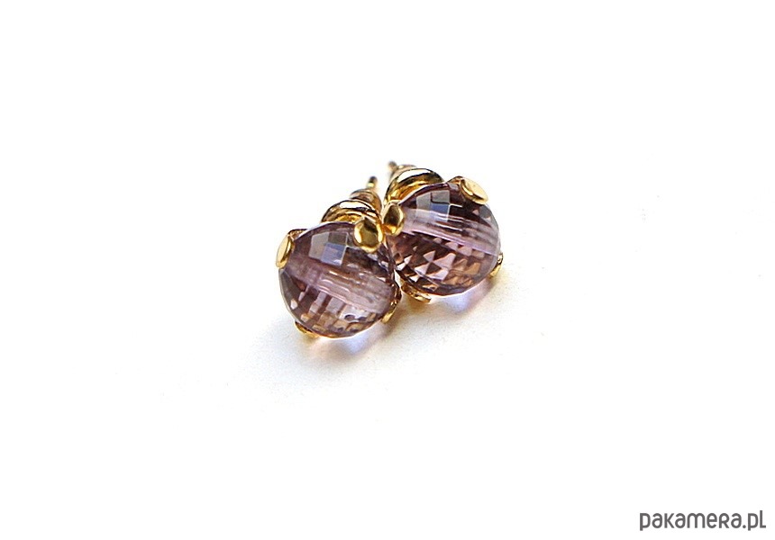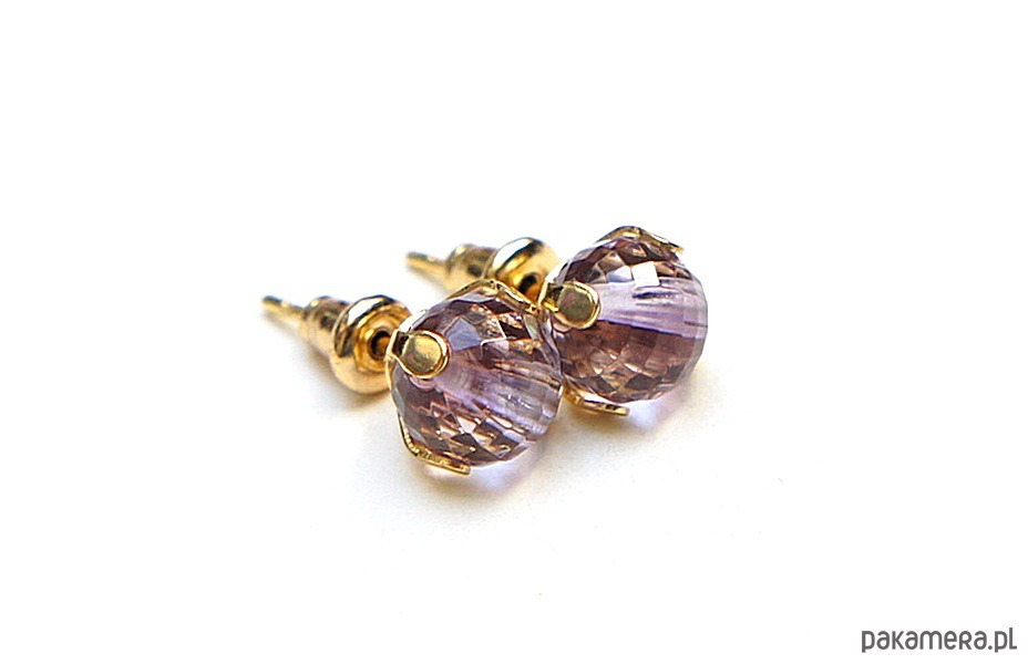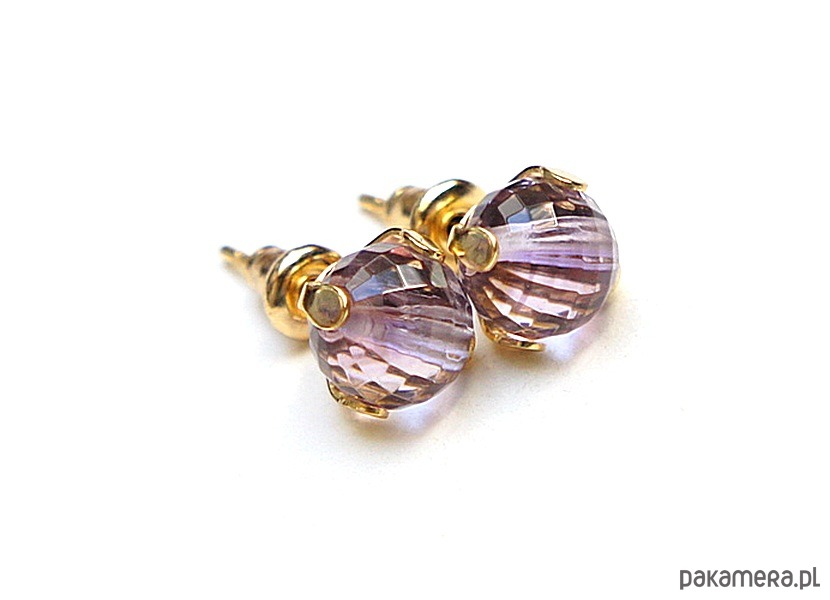 Delikatne, drobne kolczyki wykonane z naturalnych minerałów - ametysty fasetowane wysokiej jakości [6mm] oraz z pozłacanej stali szlachetnej. Zapięcie - sztyfty;